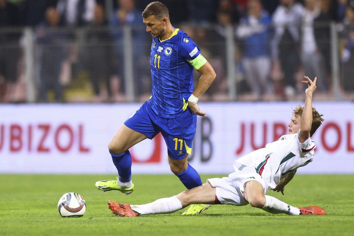 Hungary's Andras Schafer tackles Bosnia's Edin Dzeko during the Nations League soccer match between Bosnia and Hungary in Zenica, Bosnia and Herzegovina, on Monday, Oct. 14, 2024. (AP Photo/Armin Durgut)