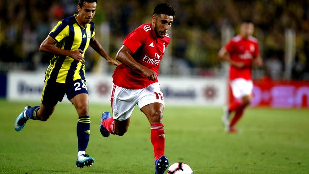 Benfica's Eduardo Salvio runs with the ball chased by Fenerbahce's Baris Alici, left, during the Champions League third qualifying round, second leg, soccer match between Fenerbahce and Benfica at the Sukru Saracoglu stadium in Istanbul, Tuesday, Aug. 14, 2018. (AP Photo/Lefteris Pitarakis)