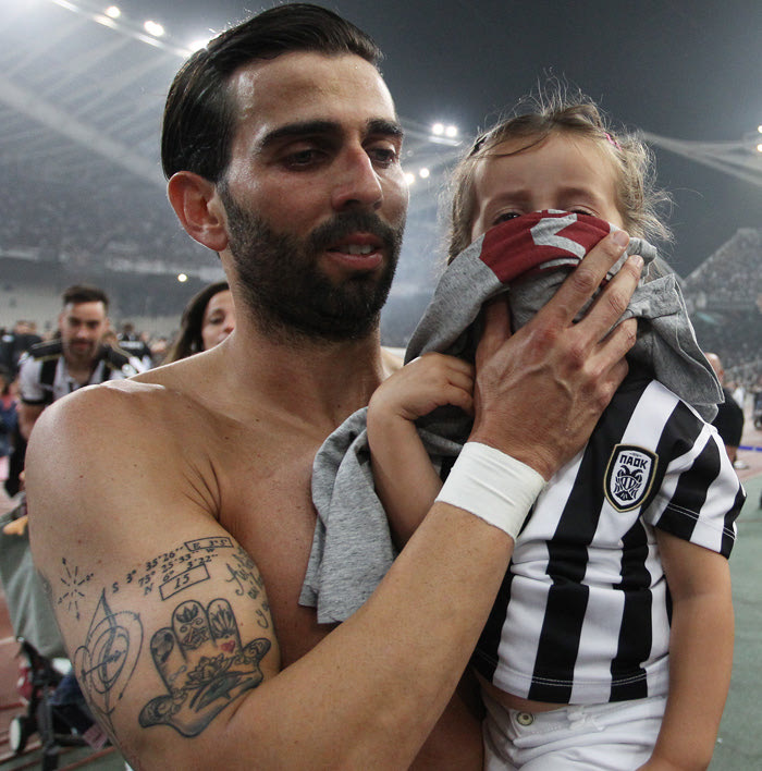 Τη στιγμή που τα επεισόδια κορυφώνονται και τα χημικά πέφτουν βροχή έξω από το γήπεδο, η ατμόσφαιρα γίνεται αποπνικτική μέσα σε αυτό. Κρατώντας στα χέρια την κόρη του, ο Ισπανός ζει δύο ρόλους και δύο συναισθήματα. Της χαράς του ποδοσφαιριστή, που μόλις έχει κατακτήσει έναν τίτλο και την ανησυχία του πατέρα, που βλέπει το παιδί του να δυσκολεύεται να αναπνεύσει. Η φωτογραφία δεν χρειάζεται περιγραφή ή ανάλυση, είναι από μόνη της ο ίδιος ο τελικός και κάθε ελληνικός τελικός ποδοσφαίρου.