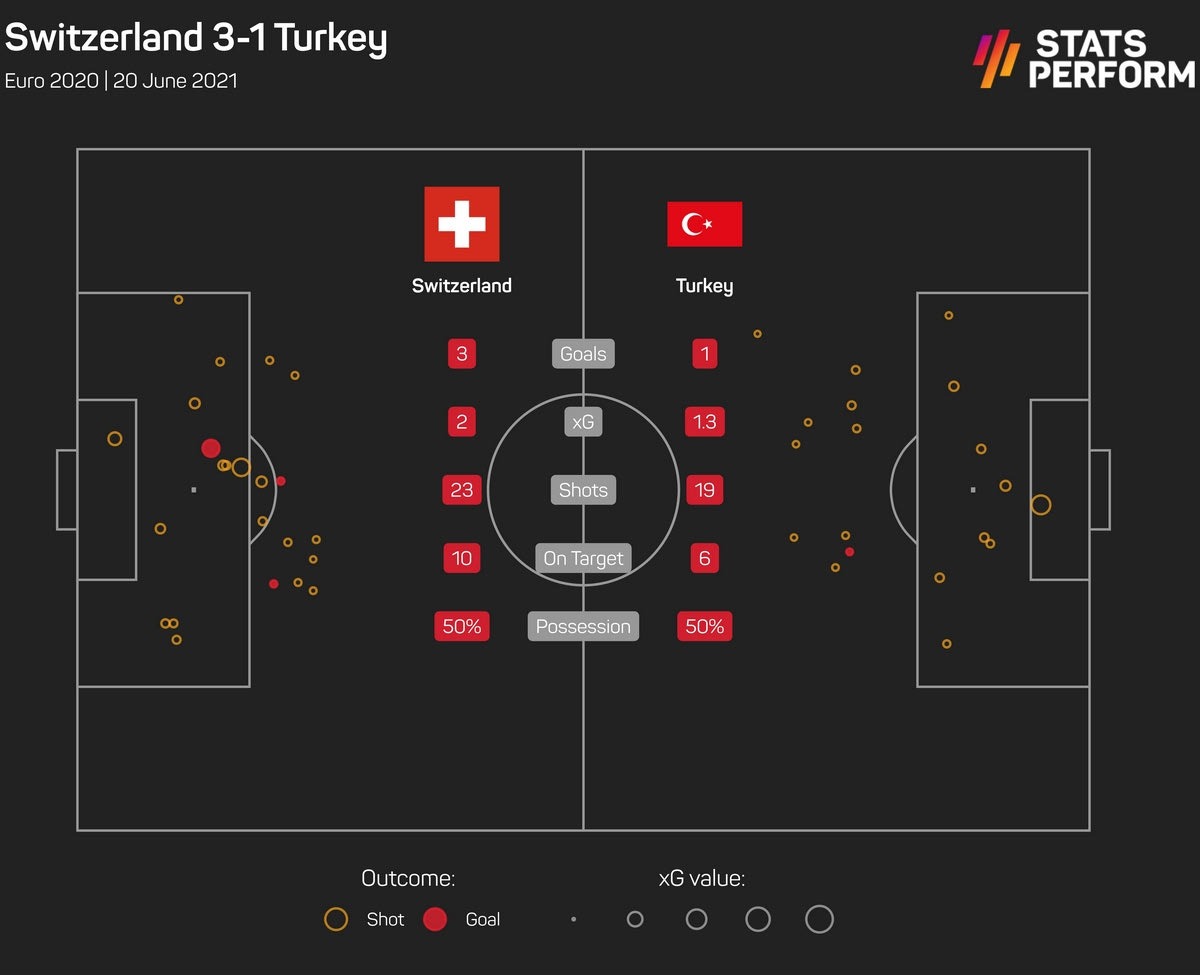 Οι 42 τελικές των δύο ομάδων (23 η Ελβετία, 19 η Τουρκία) αποτελούν ρεκόρ, αφού μετά το 1980 ποτέ δεν έχουν γίνει τόσα σουτ σε αγώνα για τη φάση των ομίλων του Ευρωπαϊκού πρωταθλήματος.