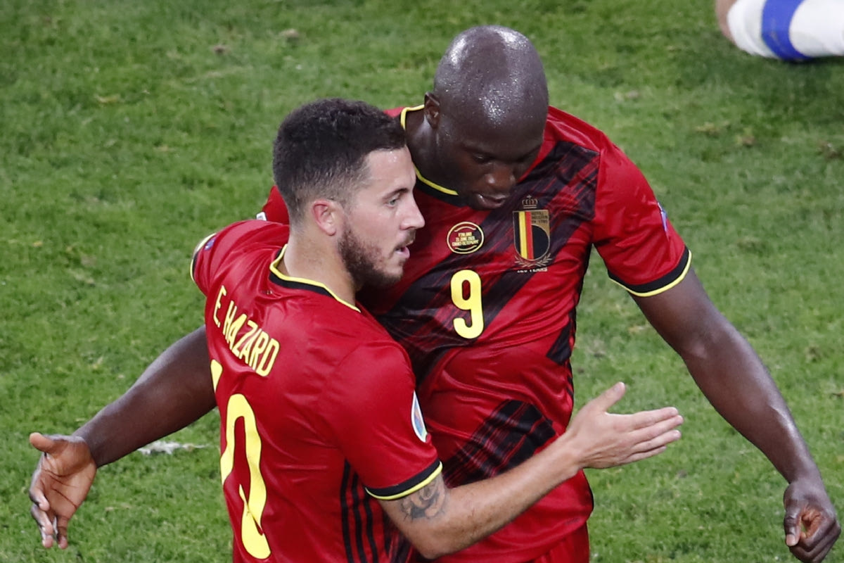 Ο Λουκάκου πανηγυρίζει το γκολ με τον Εντέν Αζάρ για το Φινλανδία - Βέλγιο © 2021 Anton Vaganov/Pool Photo via AP