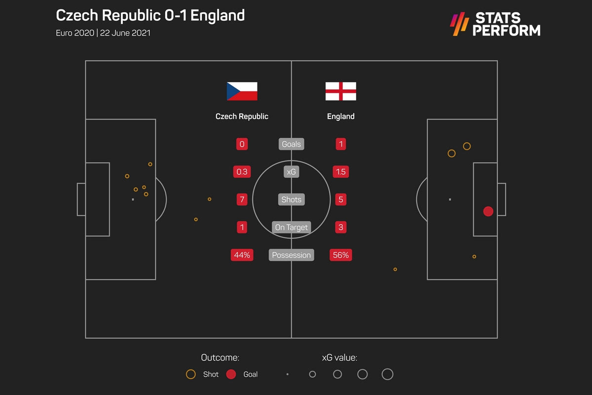 Προς το παρόν δεν του έχει στοιχίσει, αλλά η εικόνα που παρουσίασαν τα “τρία λιοντάρια” και απέναντι στην Τσεχία είναι δεδομένο πως δεν αφήνει ικανοποιημένους τους φιλάθλους. Όπως φαίνεται και στο γράφημα της Opta / Stats Perform, η Αγγλία έχει τελικές που είχαν “αξία” 1.5 xGoals και μεταφράστηκαν σε ένα γκολ.