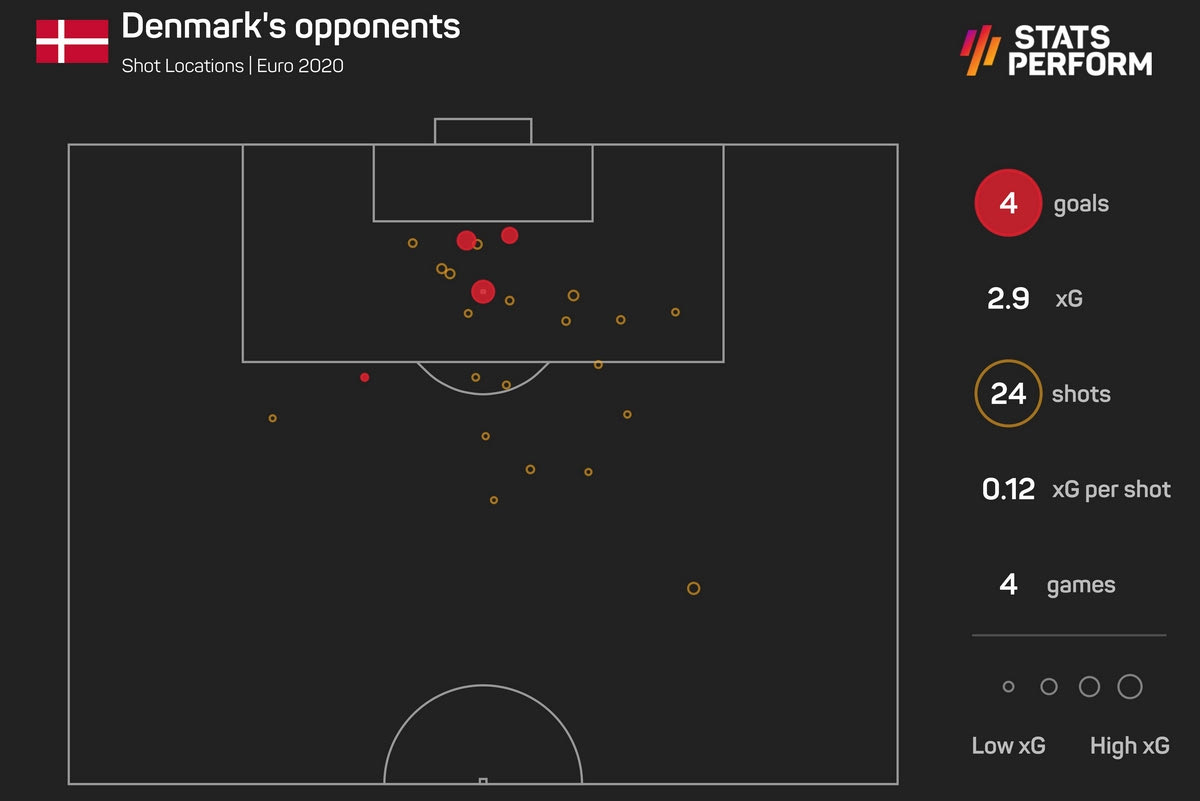 Αν αφαιρέσουμε το πέναλτι του Αρτέμ Τζιούμπα που έχει “αξία” 0.8 xGoals, τότε η Δανία έχει δεχθεί τρία τέρματα σε σύνολο 23 τελικών, με “αξία” 2.1 xGoals. Στην πραγματικότητα, το εκπληκτικό μακρινό σουτ του Κέβιν ντε Μπρόινε που κατέληξε στα δίχτυα είναι εκείνο που κάνει τη διαφορά και δεν φέρνει σε μία απόλυτη ισορροπία τα γκολ με τα xGoals των Δανών.