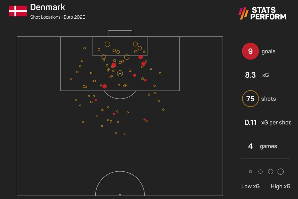 Αρχικά, μέχρι τη φάση των 16, η Δανία ήταν δεύτερη σε τελικές στη διοργάνωση με 75, πίσω μόνο από την Ισπανία που είχε 87. Μπορεί στα δύο πρώτα παιχνίδια να είχε σημειώσει μόλις ένα γκολ, παρότι είχε δημιουργήσει ευκαιρίες με “αξία” 3 xGoals (χωρίς να υπολογίζεται το χαμένο πέναλτι του Χόιμπιεργκ με τη Φινλανδία), αλλά στη συνέχεια η τύχη άλλαξε και τους έκλεισε το μάτι. Συγκεκριμένα, στα επόμενα δύο παιχνίδια οι Δανοί σημείωσαν 8(!) τέρματα, παρότι είχαν ευκαιρίες με “αξία” 4.5 xGoals. Η τύχη τους επέστρεψε όσα τους χρωστούσε (και κάτι παραπάνω).