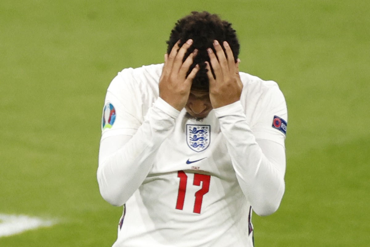 England's Jadon Sancho reacts after missing his shot at goal during a penalty shootout at the Euro 2020 soccer championship final between England and Italy at Wembley stadium in London, Sunday, July 11, 2021. (John Sibley/Pool Photo via AP)