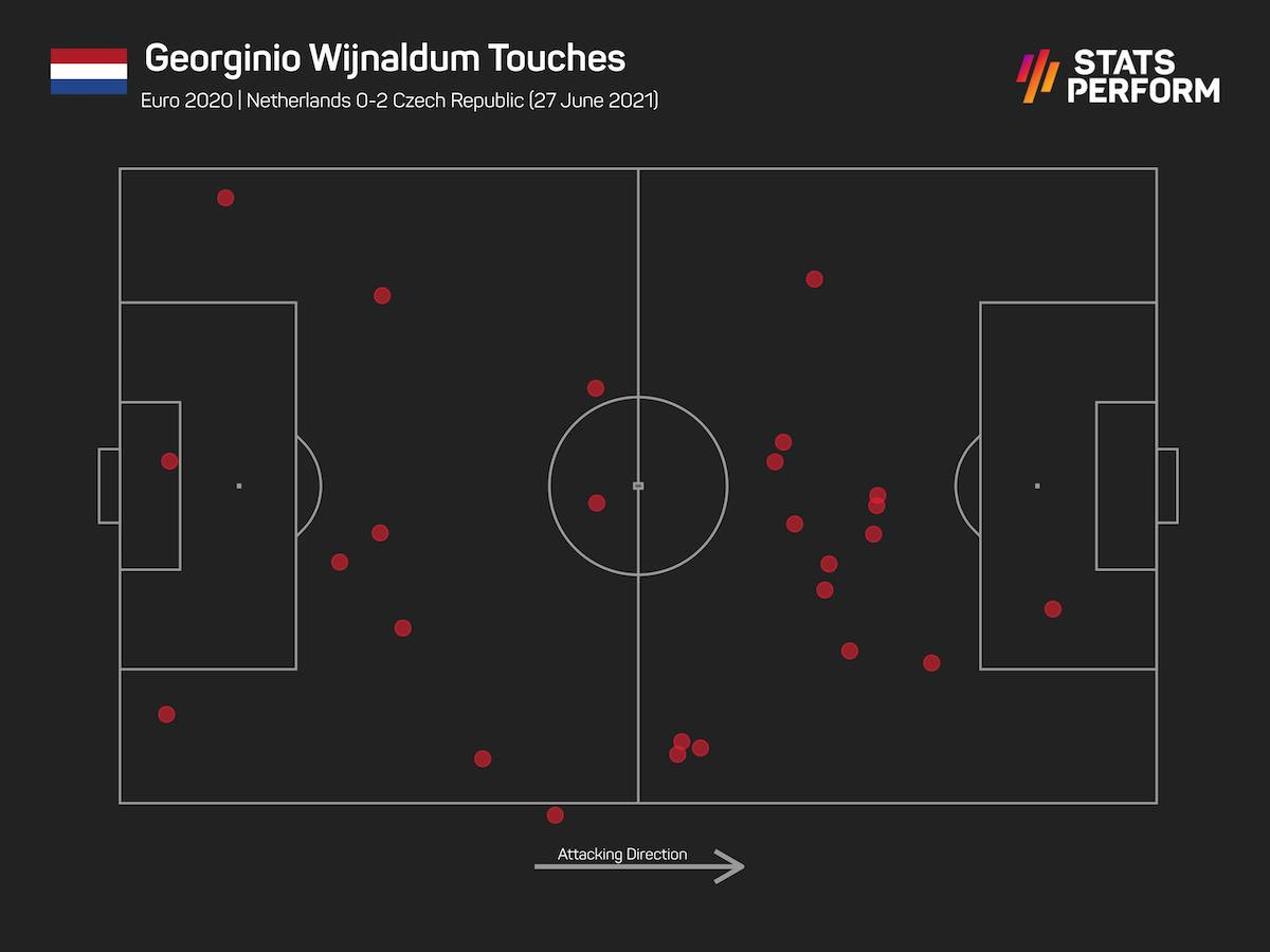 Ο 30χρονος χαφ της Παρί Σεν Ζερμέν ήταν σκιά του καλού εαυτού του, δεν κατάφερε να βρει χώρους και ουσιαστικά εξουδετερώθηκε από τους αμυντικούς και τους μέσους της Τσεχίας. Μάλιστα, ο αρχηγός των Οράνιε ολοκλήρωσε το παιχνίδι με μόλις 10 επιτυχημένες πάσες, όπως φαίνεται και από το γράφημα της Opta / Stats Perform, το οποίο αποτελεί αρνητική επίδοση για Ολλανδό ποδοσφαιριστή σε νοκ άουτ φάση από το 1980, όταν κι άρχισε η στατιστική καταγραφή.