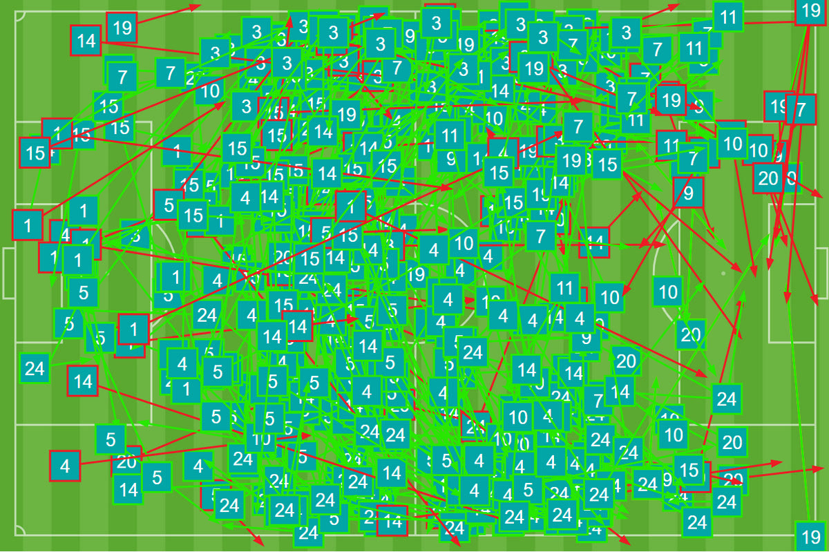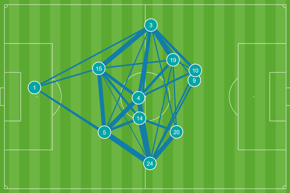 Είναι χαρακτηριστικό πως ο Κέιν ολοκλήρωσε το πρώτο μέρος με μόλις 10 επαφές με την μπάλα, εκ των οποίων μόλις μία μέσα στη μεγάλη περιοχή. Γενικότερα, όπως φαίνεται και στο παρακάτω γράφημα της Opta / Stats Perform, ο σούπερ σταρ της Τότεναμ δεν κατάφερε να συνεργαστεί με τους συμπαίκτες του, έχοντας μηδαμινή συνεισφορά στην ανάπτυξη. Είναι εμφανές πως οι Σκοτσέζοι βρήκαν το τρόπο να τον βγάλουν εκτός παιχνιδιού και την ίδια στιγμή έκαναν πιο εύκολο τα πράγματα για εκείνους.