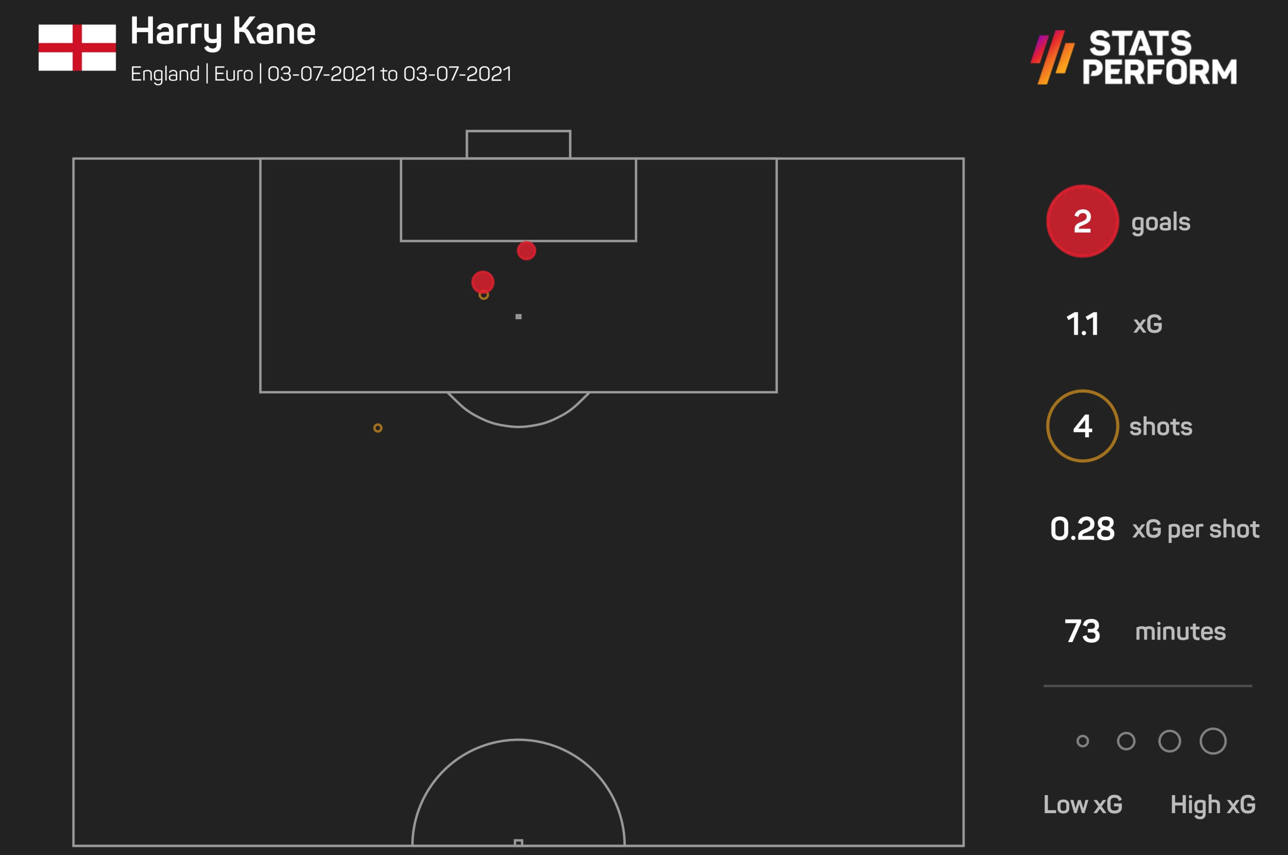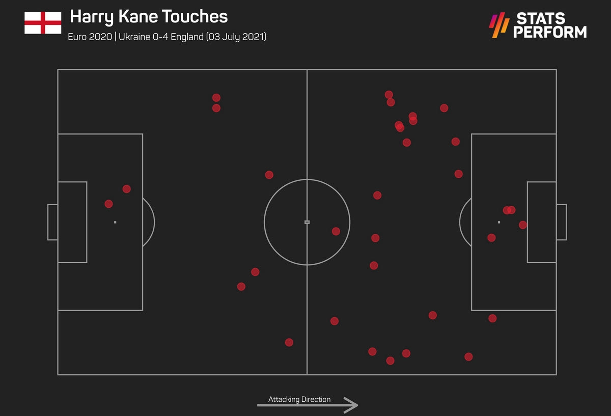 Από εκεί και πέρα, η γενικότερη παρουσία του Κέιν στο ματς ήταν καταλυτική για την εικόνα της Αγγλίας, όπως φαίνεται κι από το σχετικό γράφημα της Opta / Stats Perform με τις ενέργειές του. Σε 73 λεπτά ο σούπερ σταρ της Τότεναμ είχε 33 επαφές με την μπάλα σε όλα τα μήκη και τα πλάτη του γηπέδου, εκ των οποίων οι τέσσερις εντός περιοχής. Παράλληλα, βρήκε νικητές σε 5/7 μονομαχίες που έδωσε, ενώ είχε το απόλυτο 3/3 στον αέρα.