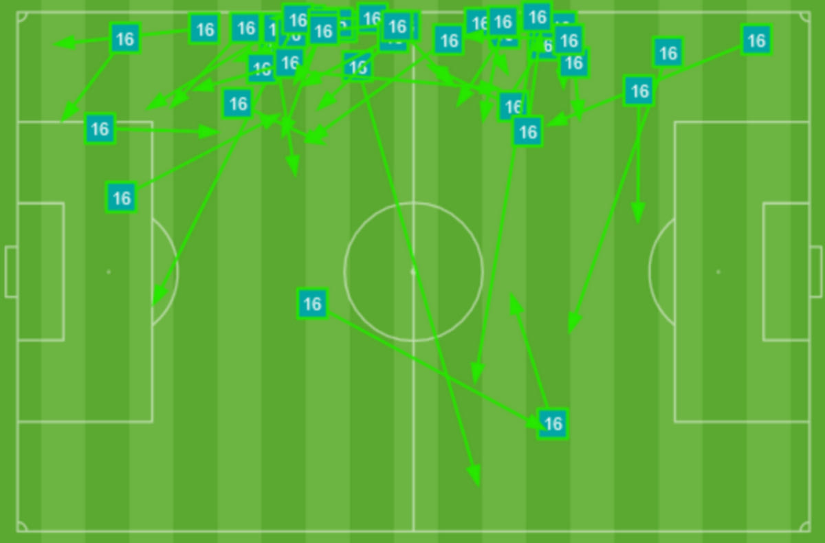 Όπως φαίνεται και στο παρακάτω γράφημα της Opta / Stats Perform, ο Αζάρ ανεβοκατέβηκε πολλές φορές την αριστερή πτέρυγα, ενώ δεν δίσταζε να συγκλίνει και να δοκιμάζει το πόδι του, όπως συνέβη και στη φάση του 1-0.