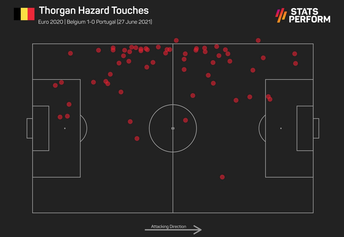 Γενικότερα, ο Αζάρ έχει συμμετοχή στα έξι απ’ τα τελευταία επτά τέρματα της ομάδας του, πετυχαίνοντας τέσσερα γκολ και μοιράζοντας δύο ασίστ. Καταλυτική, λοιπόν, η συμβολή του στο πλάνο του Ρομπέρτο Μαρτίνεθ, αλλά και στον δημιουργικό τομέα, όπως δείχνουν και οι 38 επιτυχημένες πάσες του απέναντι στους Πορτογάλους.