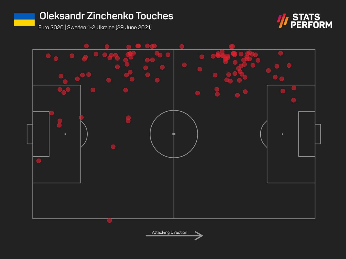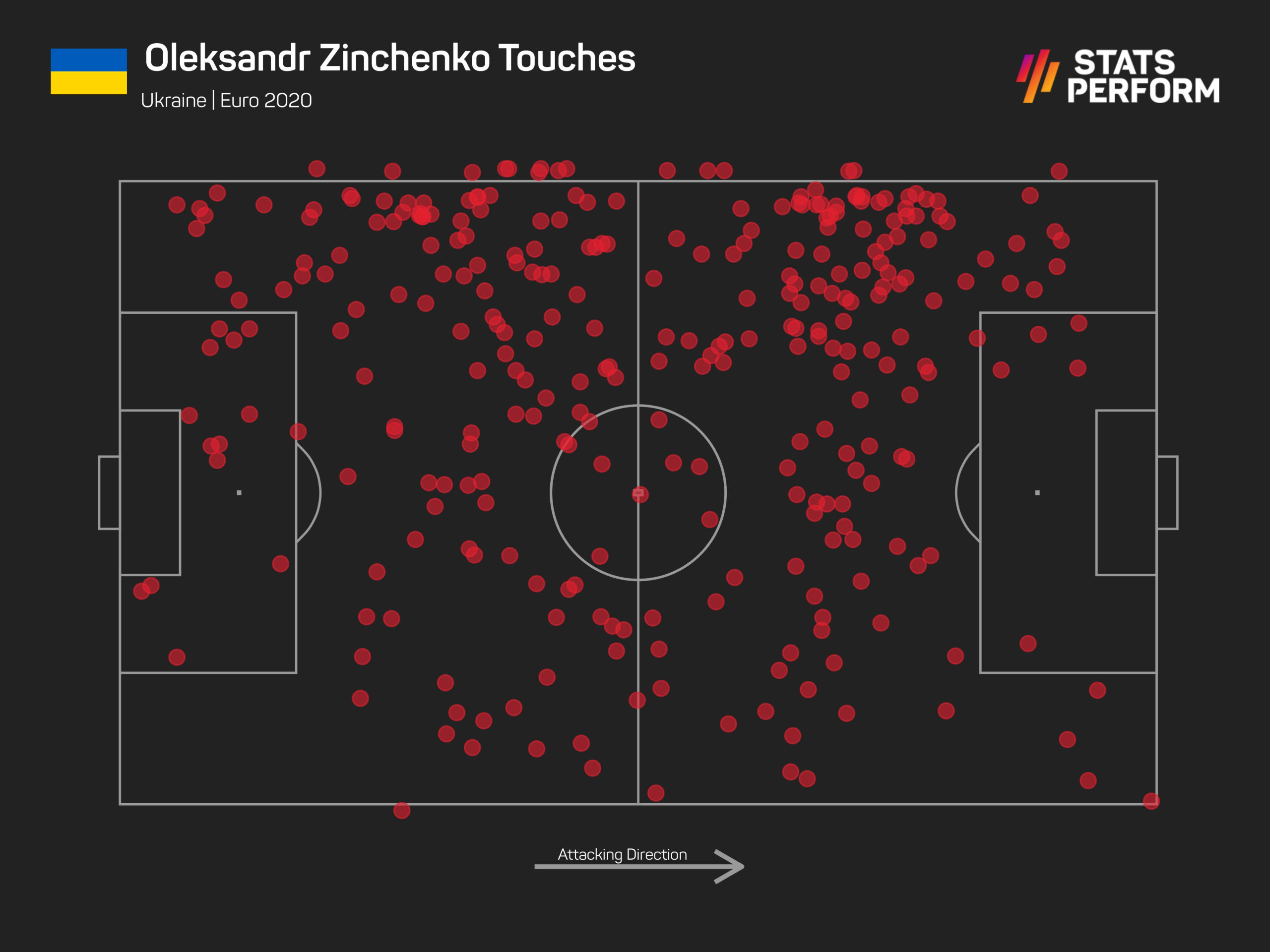 Όπως φαίνεται και στο γράφημα της Opta/StatsPerform, σχεδόν κάθε ουκρανική δημιουργία περνούσε από τα πόδια του, με τον Ζιντσένκο να έχει συμμετοχή στην πλειονότητα των επιθετικών αναπτύξεων της ομάδας του.