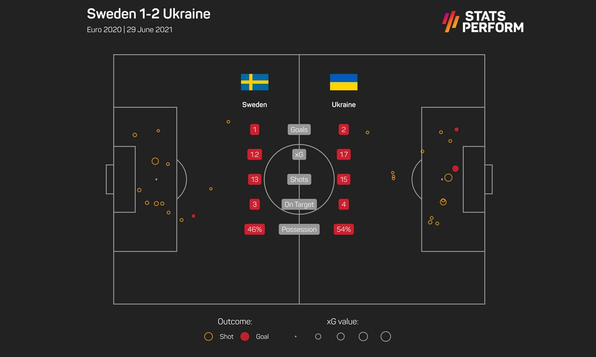Μία αναμέτρηση στην οποία η Ουκρανία ήταν ανώτερη και πιο απειλητική της αντιπάλου της, πραγματοποιώντας συνολικά 15 τελικές προσπάθειες, οι οποίες βάσει απειλής αναλογούσαν σε 1.7 xGoals, την ώρα που η Σουηδία είχε 13 με “αξία” 1,2 xGoals.