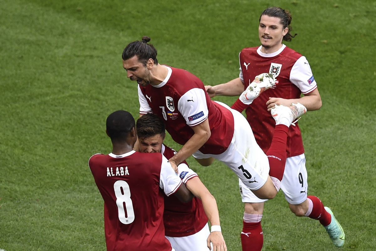 Ο Μπάουμγκαρτνερ πανηγυρίζει με τους συμπαίκτες του γκολ στο Ουκρανία - Αυστρία