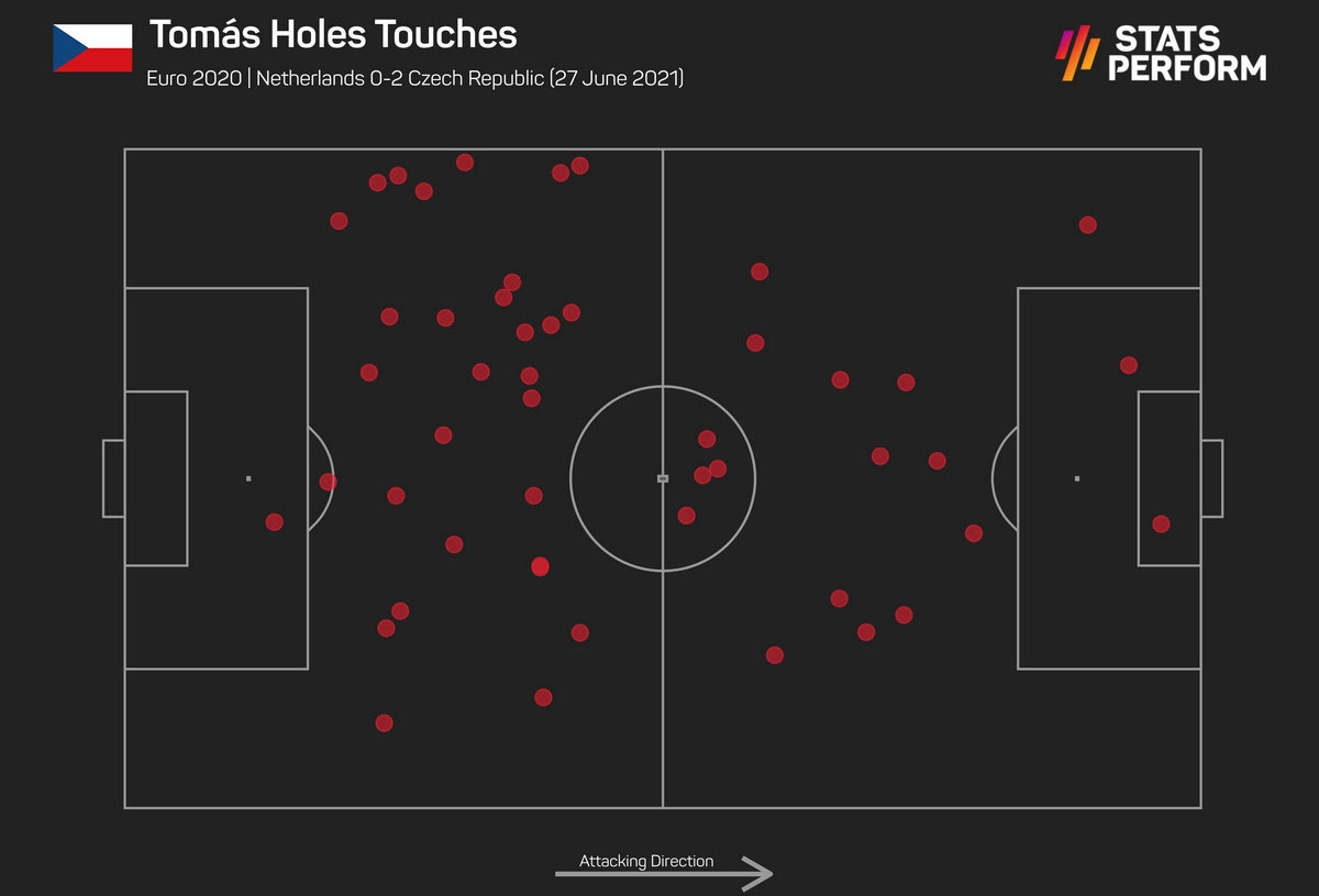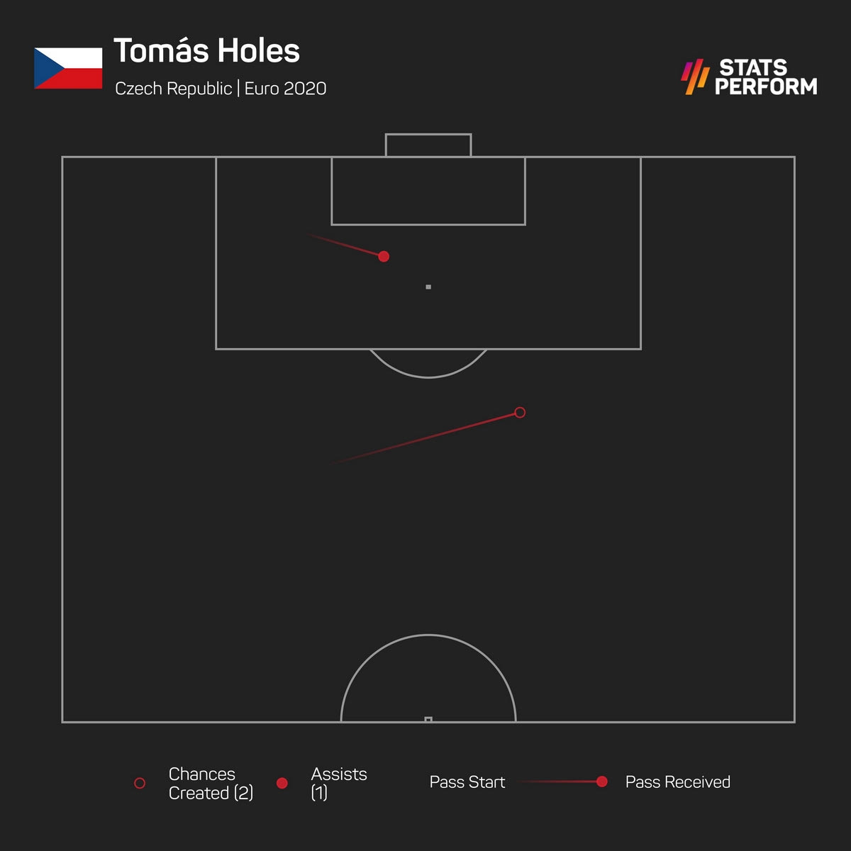 Ο Πάτρικ Σικ είναι -δίχως αμφιβολία- ο σταρ των Τσέχων, αλλά η απόδοση του 28χρονου αμυντικού χαφ της Σλάβια Πράγας έπαιξε καταλυτικό ρόλο στη μεγάλη πρόκριση. Συγκεκριμένα, όπως φαίνεται και στο γράφημα της Opta / Stats Perform, ο Χόλες είχε συμμετοχή και στα δύο γκολ της ομάδας του, ανοίγοντας το σκορ και μοιράζοντας την ασίστ στο Σικ για το 2-0.