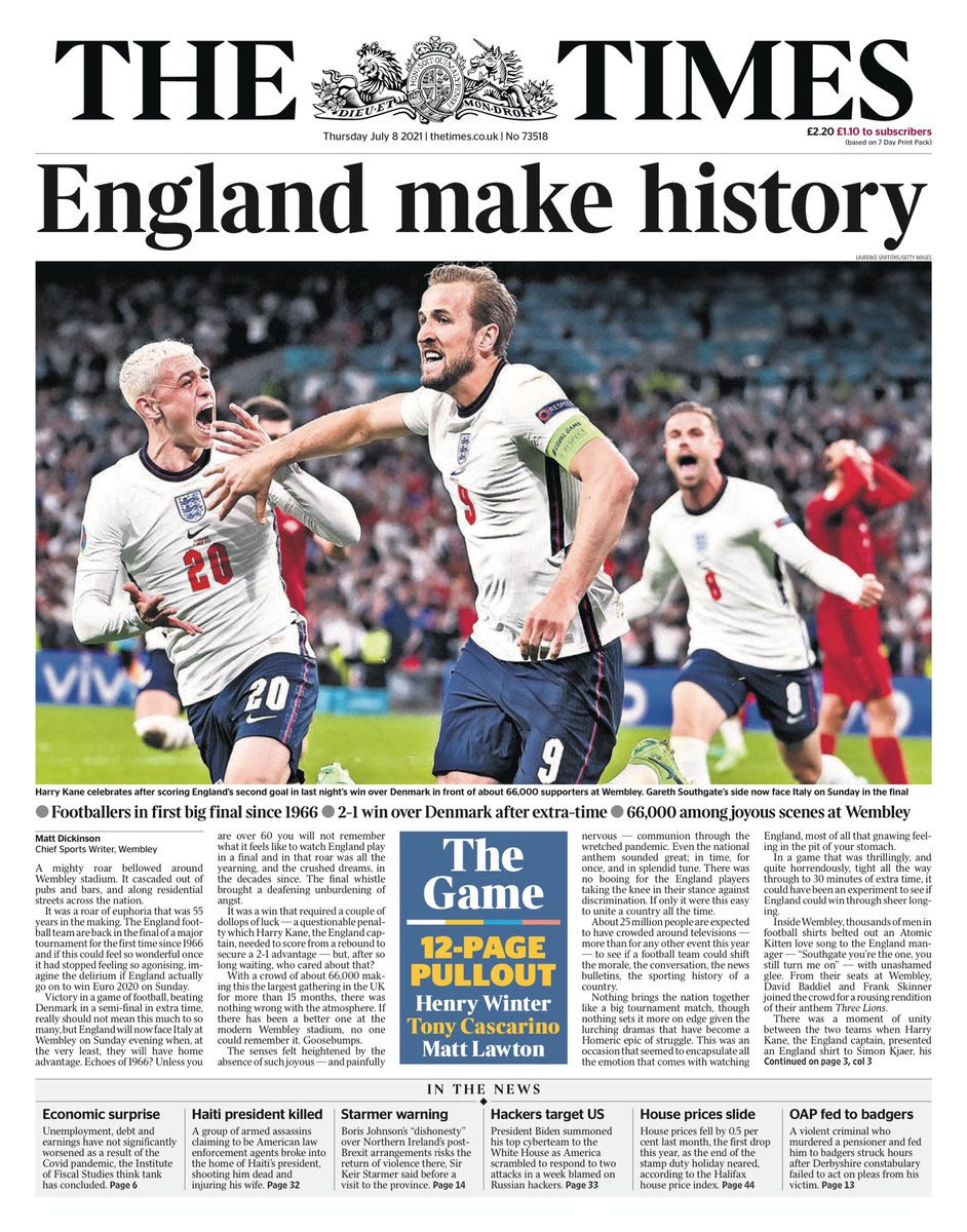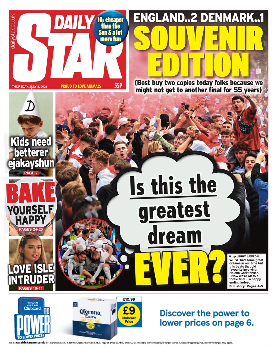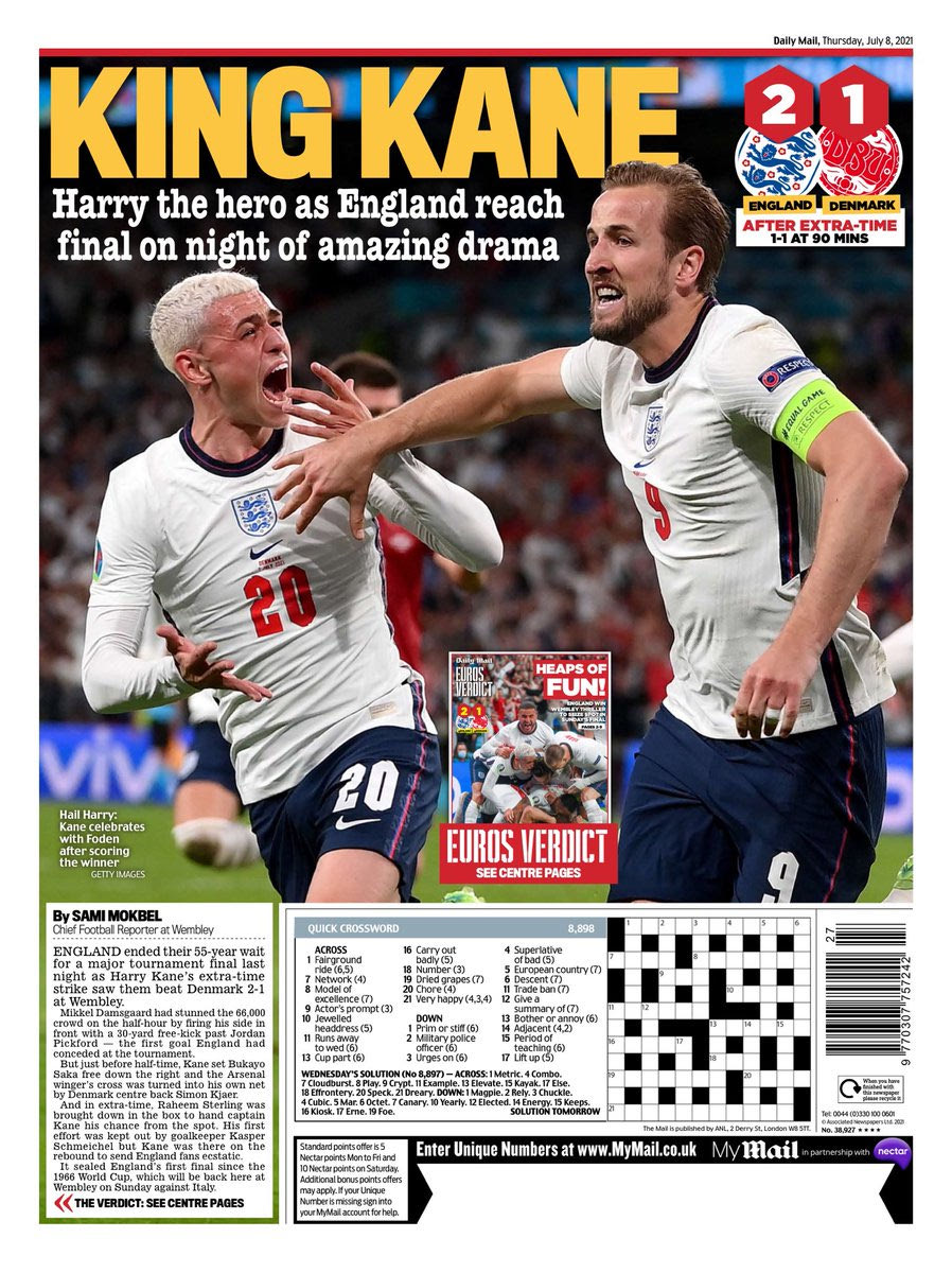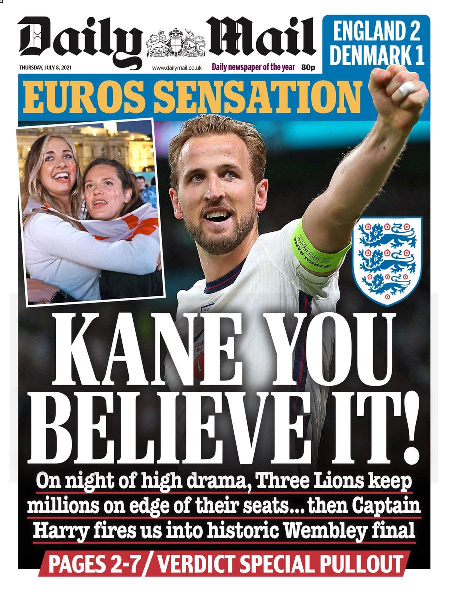Από εκεί και πέρα, η Daily Mail επέλεξε λογοπαίγνιο με τον Χάρι Κέιν, ρωτώντας τους αναγνώστες: “Kane you believe it?” (Μπορείτε να το πιστέψετε;). “King Kane”, ήταν η επιλογή της ίδιας εφημερίδας και το οπισθόφυλλο.