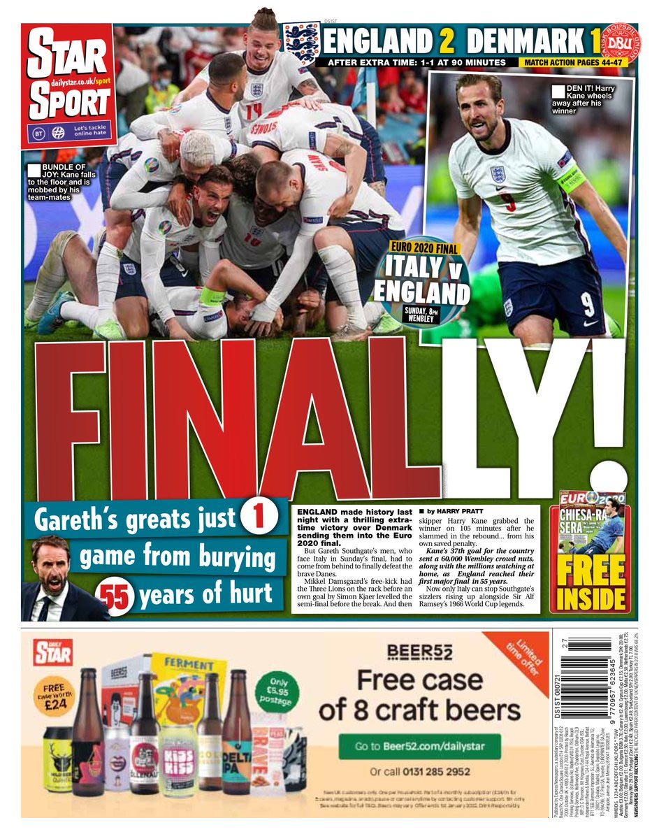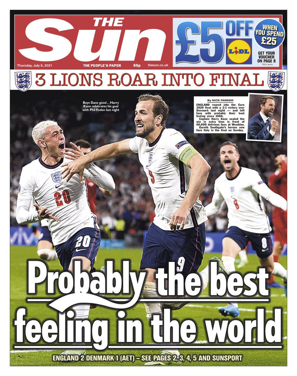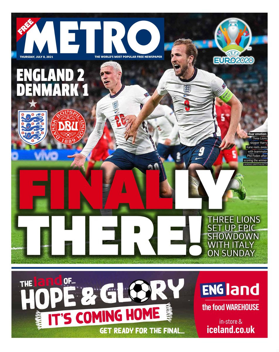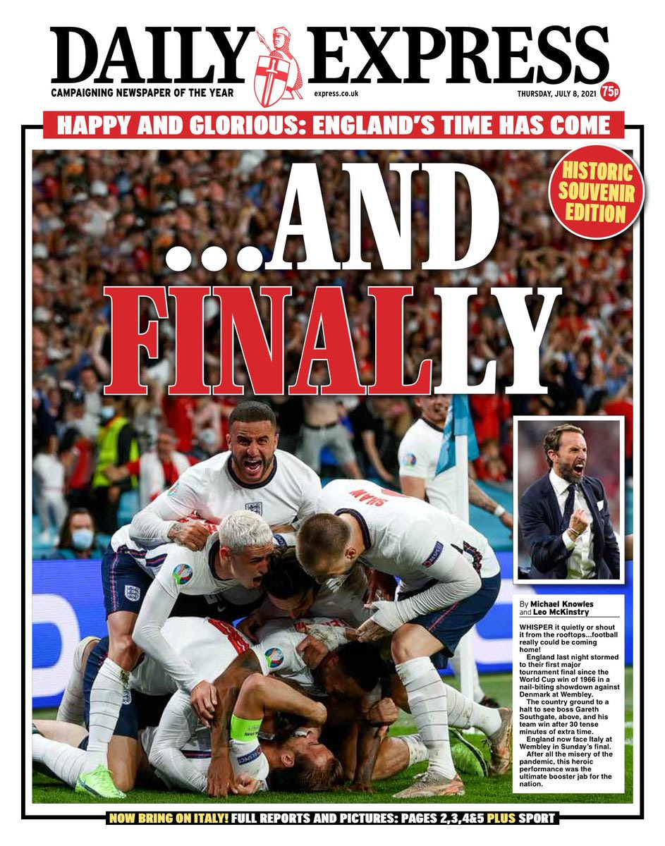 Τα πρωτοσέλιδα για την πρόκριση της Αγγλίας στον τελικό του Euro 2020 είχαν έναν κοινό παρονομαστή: Final-ly! Το λογοπαίγνιο έχει να κάνει με το Final (=τελικός) και το Finally (=επιτέλους) και ήταν η επιλογή των περισσοτέρων εντύπων της χώρας για να υποδεχθούν μία μοναδική στιγμή των τελευταίων 55 ετών.