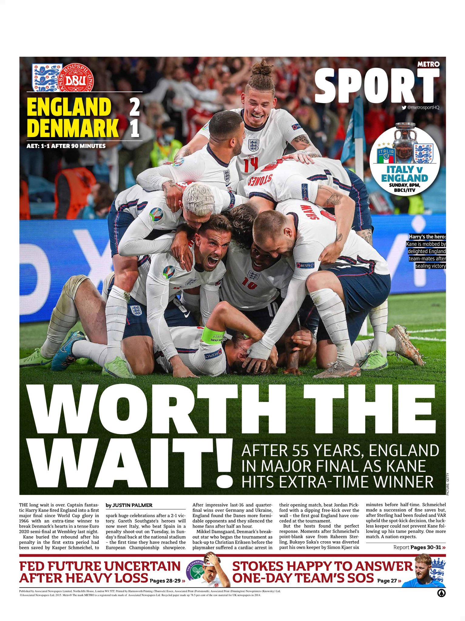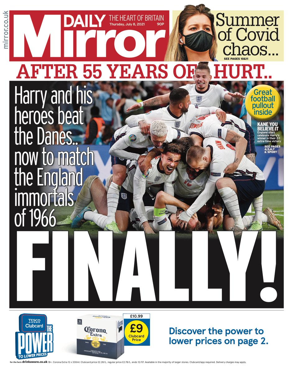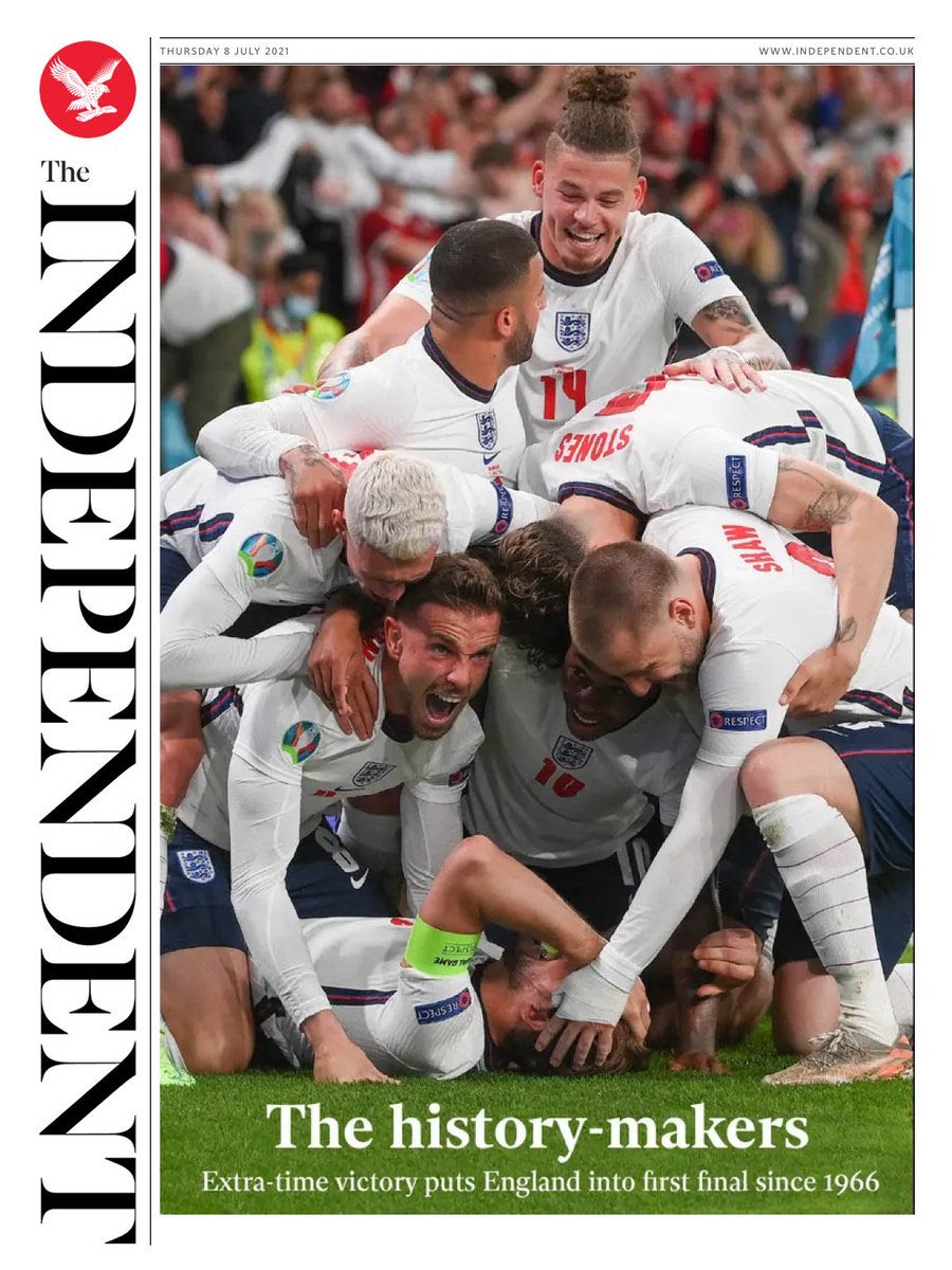 Τα πρωτοσέλιδα για την πρόκριση της Αγγλίας στον τελικό του Euro 2020 είχαν έναν κοινό παρονομαστή: Final-ly! Το λογοπαίγνιο έχει να κάνει με το Final (=τελικός) και το Finally (=επιτέλους) και ήταν η επιλογή των περισσοτέρων εντύπων της χώρας για να υποδεχθούν μία μοναδική στιγμή των τελευταίων 55 ετών.
