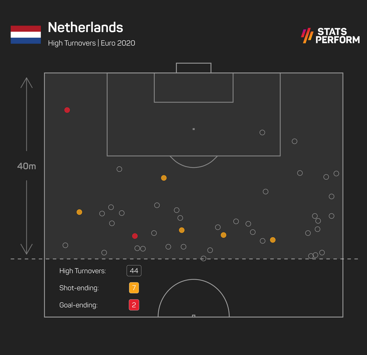 Είναι χαρακτηριστικό πως στα πρώτα τρία παιχνίδια της διοργάνωσης, οι Οράνιε οδήγησαν -χάρη στο υψηλό πρέσινγκ- τους αντιπάλους τους σε 44 λάθη, μέσα απ’ τα οποία προέκυψαν επτά τελικές και δύο γκολ, όπως φαίνεται και στο γράφημα της Opta / Stats Perform.