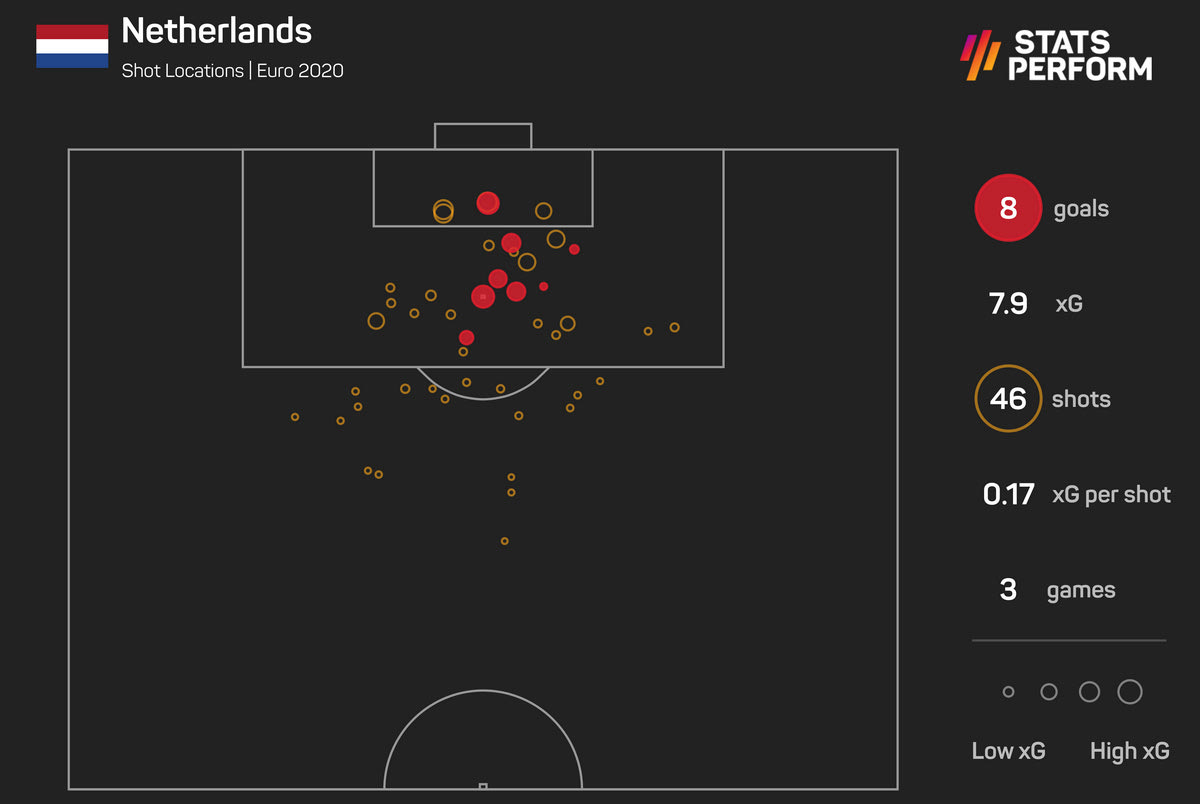 Επιπλέον, όπως φαίνεται στο γράφημα της Opta / Stats Perform, οι Οράνιε απειλούν από καλές θέσεις μέσα στην περιοχή, με συνέπεια να ανεβάζουν και τις πιθανότητες για γκολ.