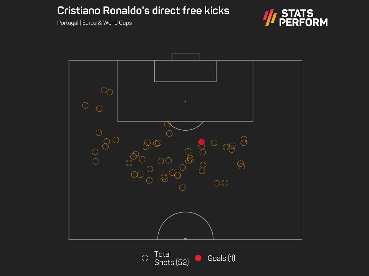 Ο Ρονάλντο έχει ένα γκολ σε 52 εκτελέσεις φάουλ σε Euro και Μουντιάλ. Στα Ευρωπαϊκά έχει 0/28 και στα Παγκόσμια έχει 1/24, το συνολικό ποσοστό του είναι 1.9%.