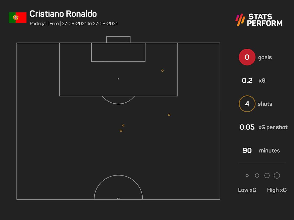 “Κλειδί” για τους Βέλγους αποδείχθηκε το γεγονός πως κατάφεραν να βγάλουν τον Ρονάλντο μακριά από το πεδίο δράσης του. Δείτε στο γράφημα της Opta / Stats Perform τις τελικές και τα expected goals που είχε ο Κριστιάνο στον τελευταίο αγώνα του στο φετινό Euro.