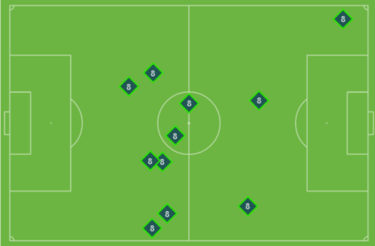 Μάλιστα, ήταν ο ποδοσφαιριστής με τις περισσότερες κερδισμένες μονομαχίες (11) στον αγώνα, ενώ αντίστοιχα καλή παρουσία είχε στον αέρα με 7/9 επιτυχημένες διεκδικήσεις της μπάλας. Από εκεί και πέρα, είχε δύο κερδισμένα τάκλιν, τέσσερις ανακτήσεις κατοχής, ενώ δύο φορές είχε ενέργειες μέσα στη μεγάλη περιοχή, με ισάριθμες