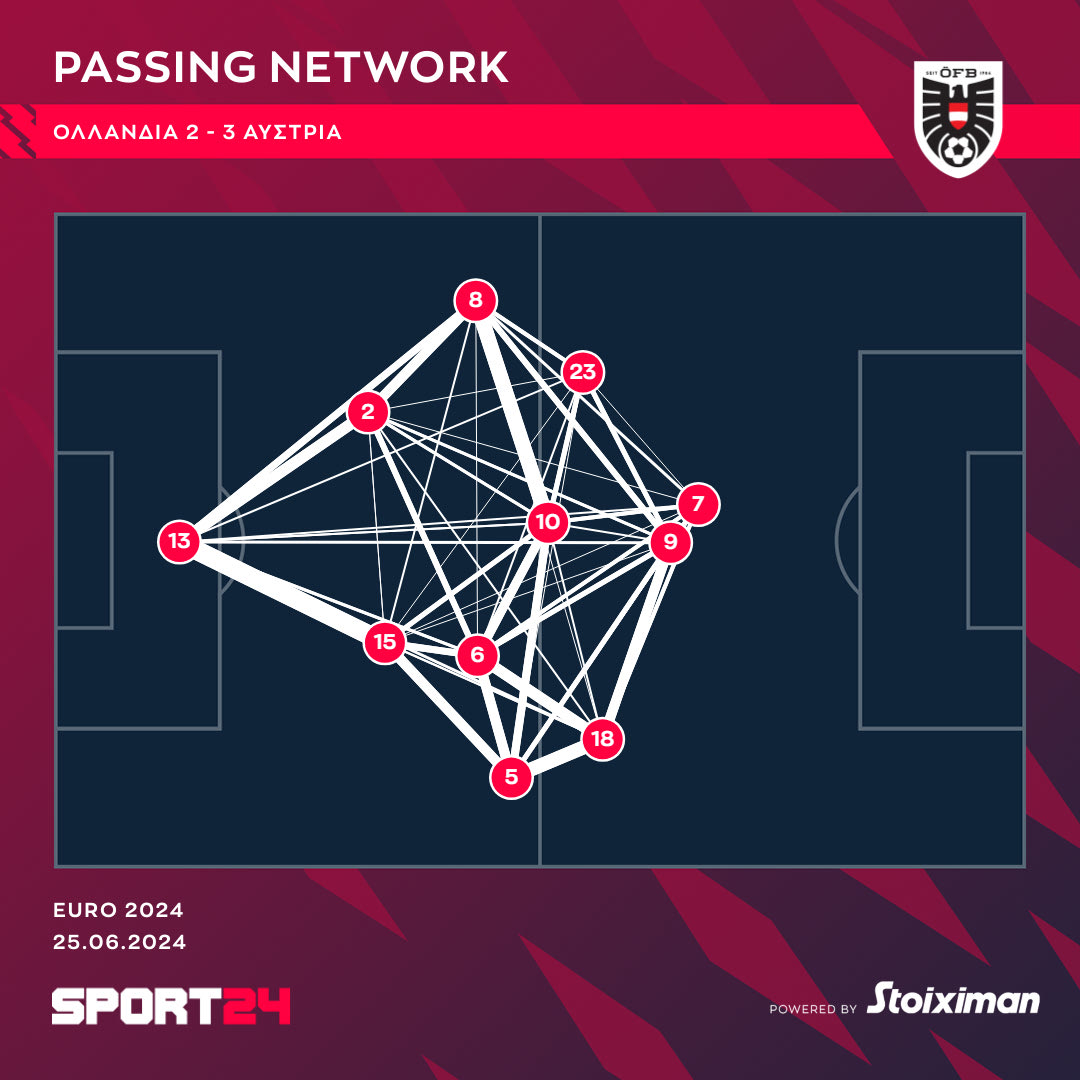 Ο μέσος χώρος δράσης του Ζάμπιτσερ (9) ήταν ψηλά στον αγωνιστικό χώρο, λίγο πιο πίσω από τον φορ τον Αρναούτοβιτς (7). Αρκετές φορές κινήθηκε στις γραμμές του αντιπάλου ή και πίσω από αυτές, όπως συνέβη στη φάση του γκολ.