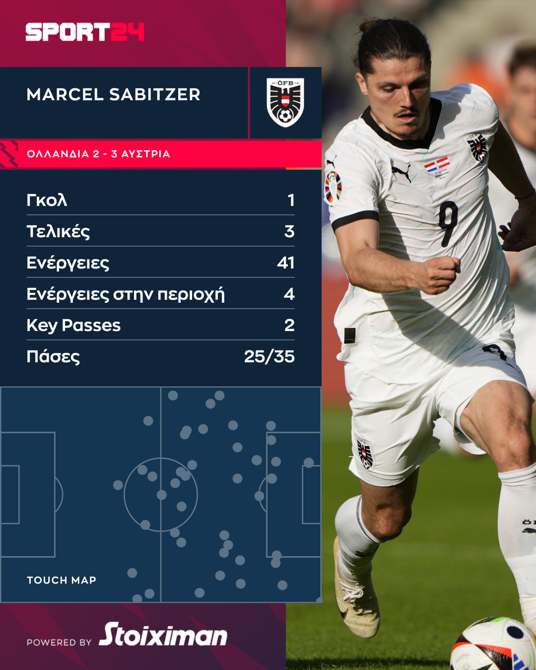 Ο Ζάμπιτσερ δεν είχε μόνο το γκολ που έδωσε το τρίποντο στους Αυστριακούς, καθώς πολύτιμη, όπως είπαμε ήταν όλη του η παρουσία. Στο γράφημα της Opta/Stats Perform μπορείτε να δείτε όλες τις ενέργειές του και τις κορυφαίες του επιδόσεις.