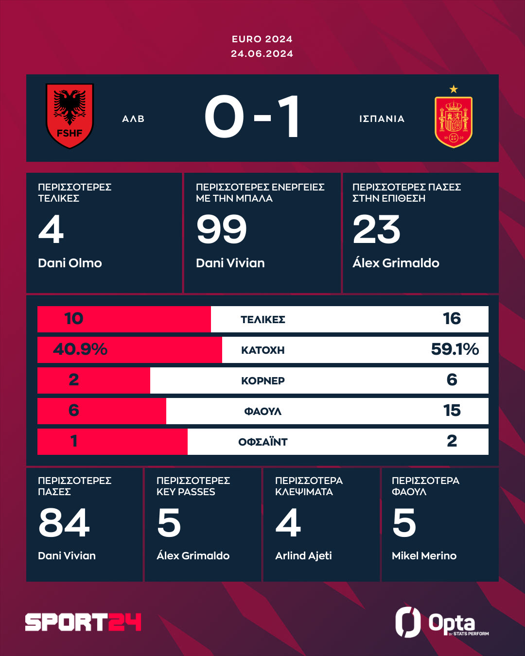Η Ισπανία συνεχίζει στους “16” και περιμένει αντίπαλο ως πρώτη του ομίλου, ενώ η Αλβανία τερμάτισε στην τελευταία θέση του ομίλου με 1-0.