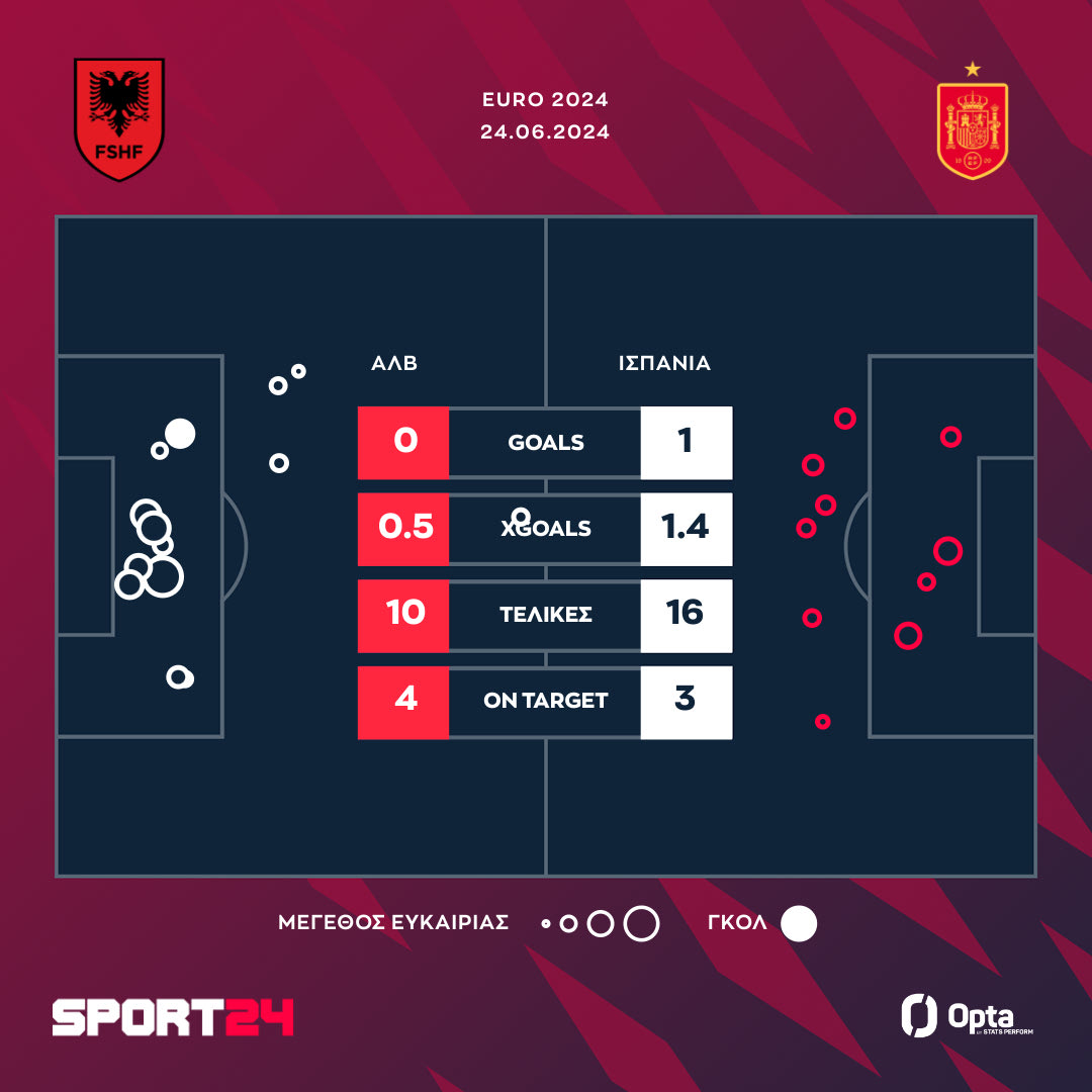 Οι Ισπανοί ήταν καλύτεροι στο μεγαλύτερο κομμάτι, με την Αλβανία να έχει δύο – τρεις καλές στιγμές για να σκοράρει, αλλά το γκολ δεν ήρθε ποτέ.