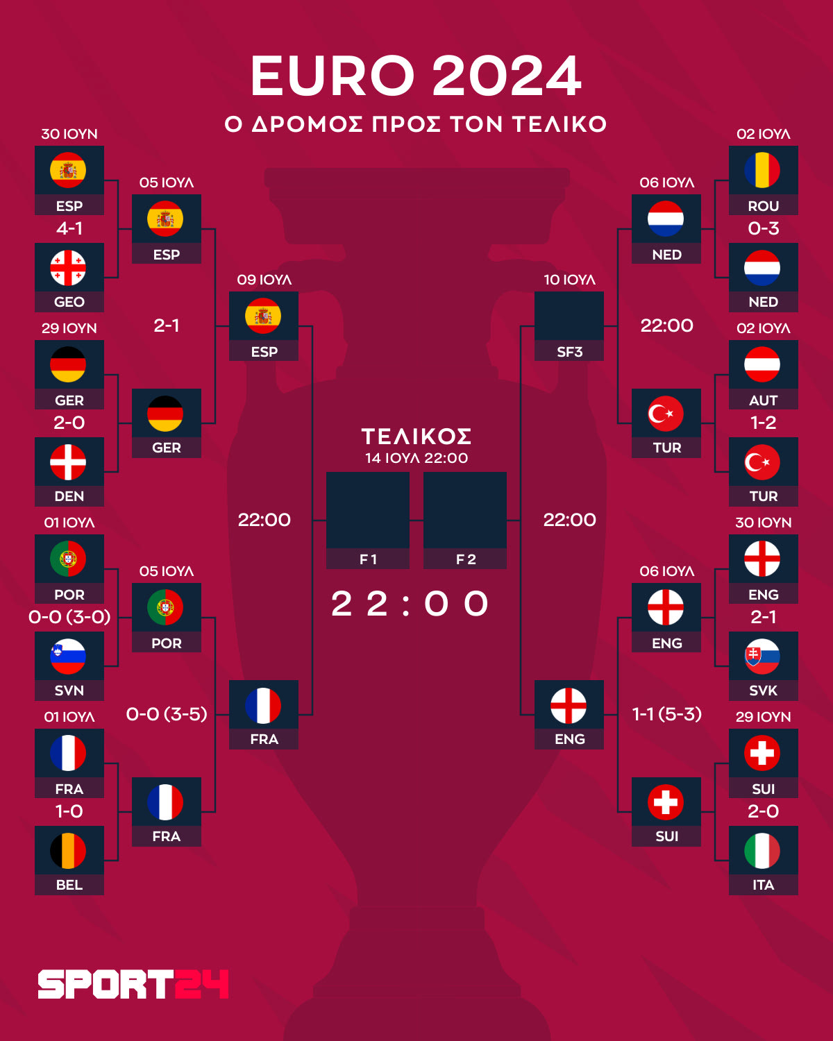 Η Αγγλία πήρε την πρόκριση για τα ημιτελικά στα πέναλτι, επικρατώντας της Ελβετίας 5-3. Η κανονική διάρκεια και η παράταση έληξαν 1-1 χάρη στα γκολ των Εμπολό στο 75' και Σάκα στο 80'. Τα τρία λιοντάρια περιμένουν τον νικητή του Ολλανδία - Τουρκία.