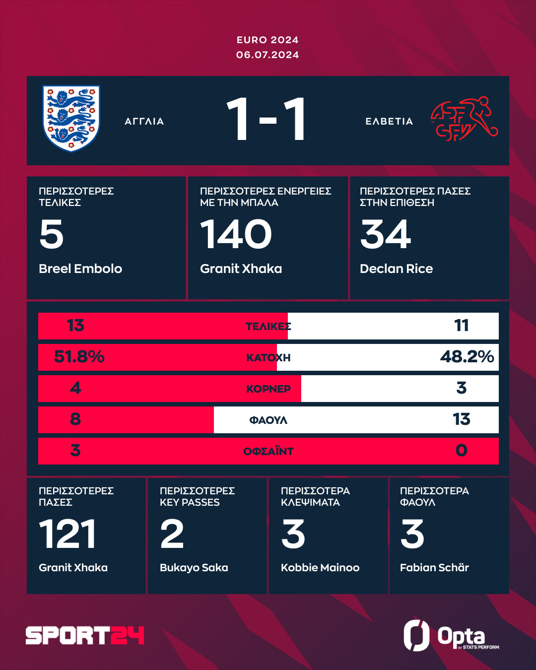 Η Αγγλία έδειξε σφιγμό και ισοφάρισε με το απίθανο τελείωμα του Σάκα στο 80ο λεπτό που δεν άφησε περιθώρια στον Ζόμερ. Στο φινάλε ο Τσούμπερ πήρε την μπάλα μέσα στην περιοχή έκανε το σουτ, αλλά δεν είχε ισορροπία και η πάλα πήγε ψηλά.