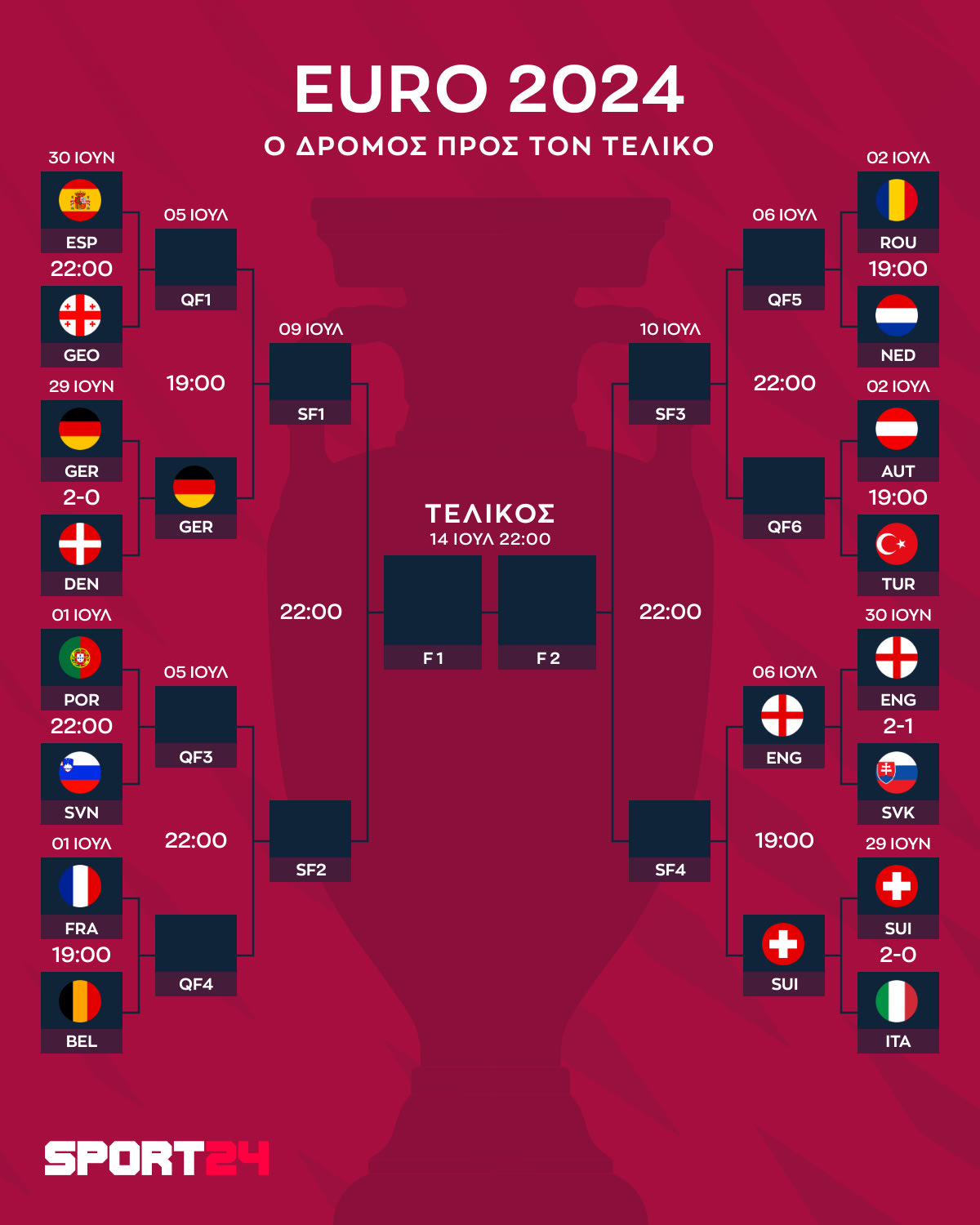 Η Αγγλία θα αντιμετωπίσει την Ελβετία στους “8”. Η αναμέτρησή τους θα διεξαχθεί στις 6 Ιουλίου στις 19:00 στο Ντίσελντορφ.