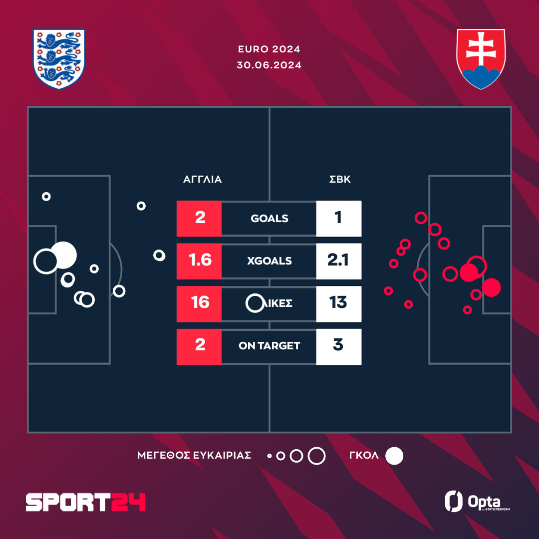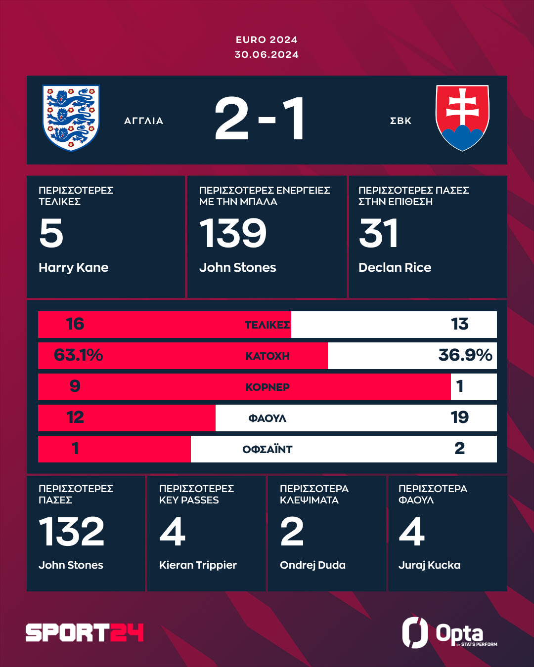 Η Σλοβακία κρατούσε την πρόκριση στα χέρια της μέχρι και το 90+5′, έχοντας προηγηθεί με τον Σχραντζ στο 25′, ωστόσο η Αγγλία έσωσε την παρτίδα με τον Μπέλιγχαμ και έστειλε το ματς στην παράταση. Εκεί κατάφερε να φέρει τούμπα το ματς με τον Χάρι Κέιν στο 91′ και να προκριθεί στα προημιτελικά του Euro 2024.