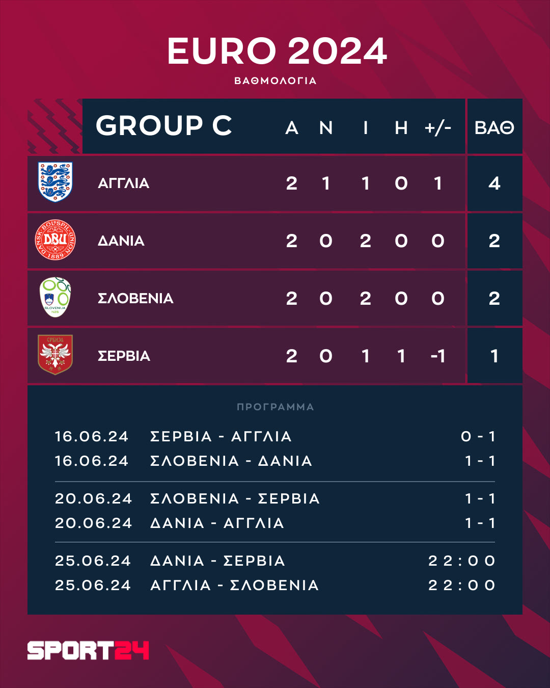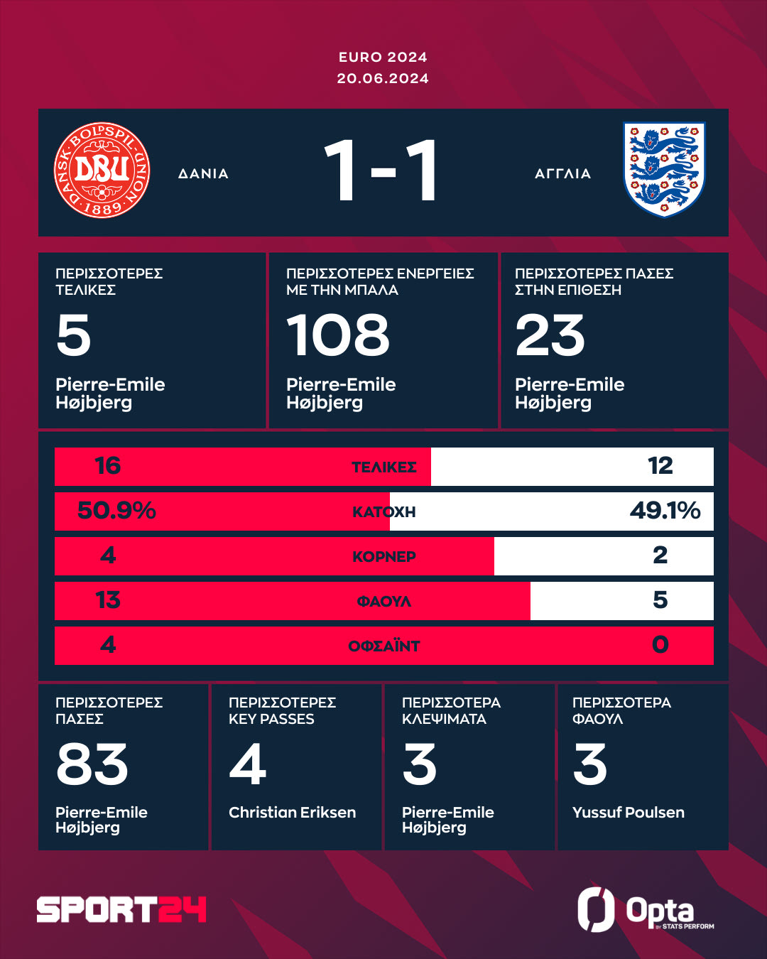 Στο δεύτερο μέρος οι δύο ομάδες είχαν ευκαιρίες για να σκοράρουν με καλύτερη το δοκάρι του Φόντεν στο 56ο λεπτό, ωστόσο το 1-1 παρέμεινε μέχρι το τέλος. Η Αγγλία με αυτό το βαθμό έφτασε στους “4” και είναι μια ανάσα από την πρόκριση στους “16” του Euro 2024. Πιο δύσκολα τα πράγματα για τη Δανία που θα παλέψει με τη Σερβία την τελευταία αγωνιστική για την πρόκριση.