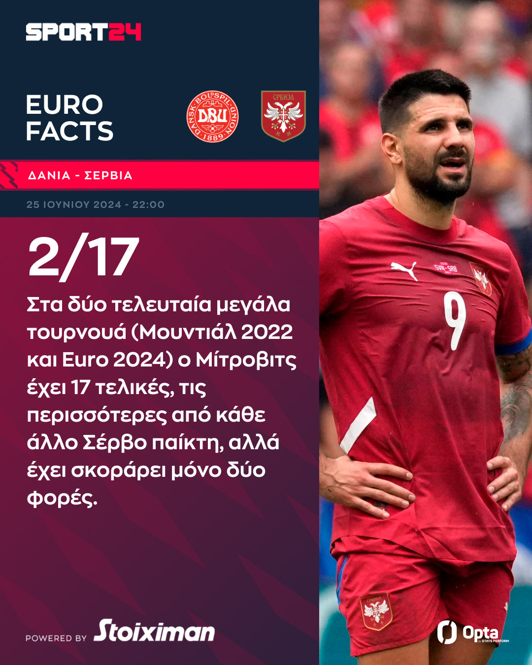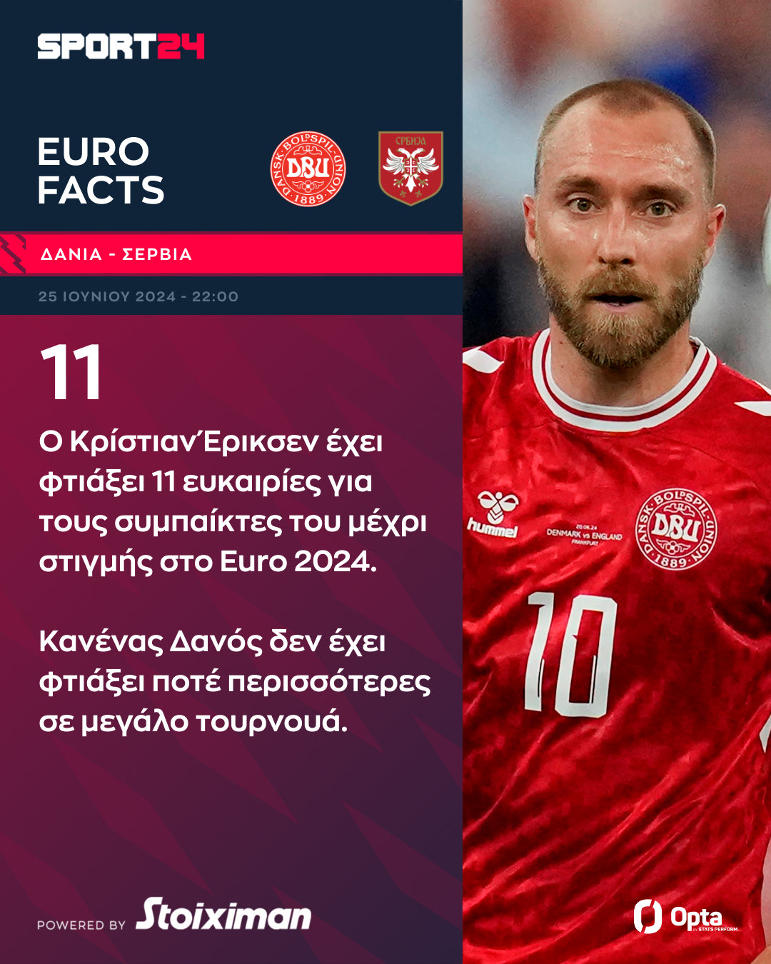 Δανία και Σερβία μονομαχούν στην Allianz Arena του Μονάχου (25/06, 22:00, ΕΡΤ3 και Live SPORT24) και θέλουν την πρώτη τους νίκη στο Euro 2024 που μπορεί να αποδεχθεί και αρκετή για να τους δώσει την πρόκριση στους “16”. Δείτε μερικά ενδιαφέρονται στοιχεία του αγώνα από την Opta.