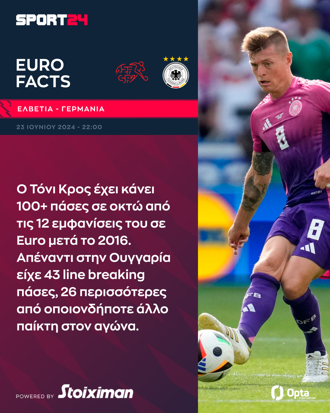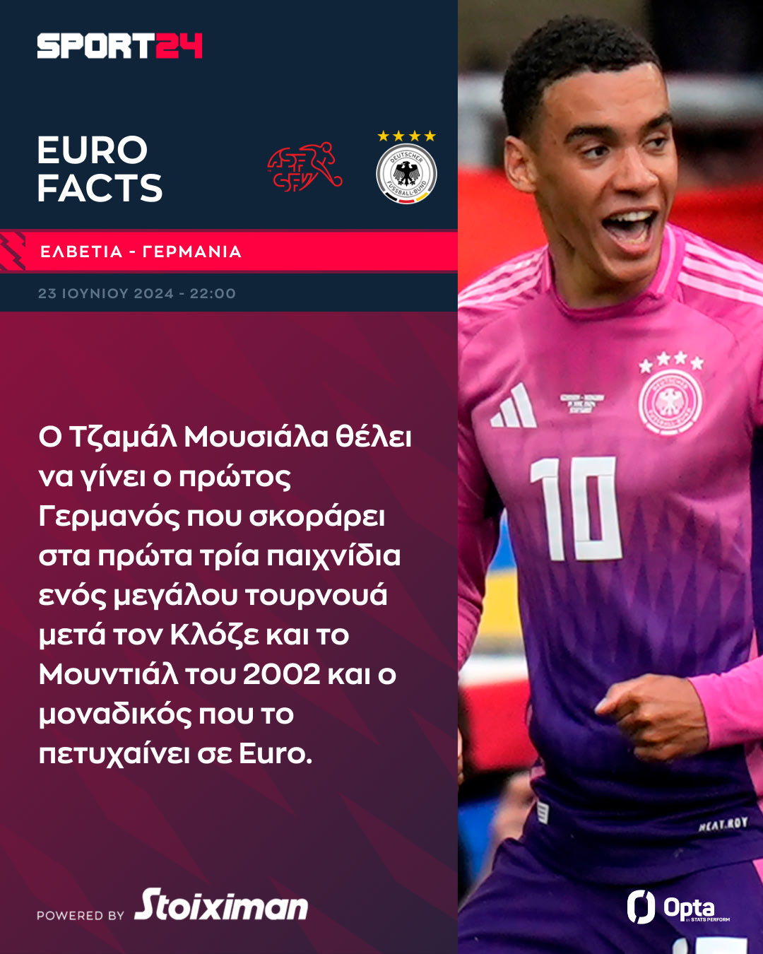 Η Γερμανία έχει πάρει την πρόκριση στους 16 του Euro 2024 και την Κυριακή (23/6, 22:00, ΕΡΤ1, LIVE SPORT24) αντιμετωπίζει την άνετη Ελβετία. Δείτε ορισμένα χρήσιμα στοιχεία για την αναμέτρηση, με τη βοήθεια τη Opta.