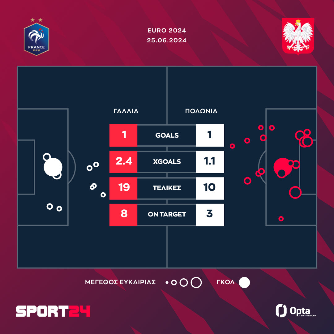 Στη δεύτερη συμμετοχή του ήταν ακόμα πιο απειλητικός, καθώς κόντρα στους Πολωνούς είχε έξι τελικές οι πέντε εκ των οποίων από το 42′ μέχρι και το 56′ όταν ευστόχησε σε πέναλτι. Ο Εμπαπέ σε αυτό το ματς “έγραψε” 1.3 xGoals με το πέναλτι και 0.51 non penalty xGoals.