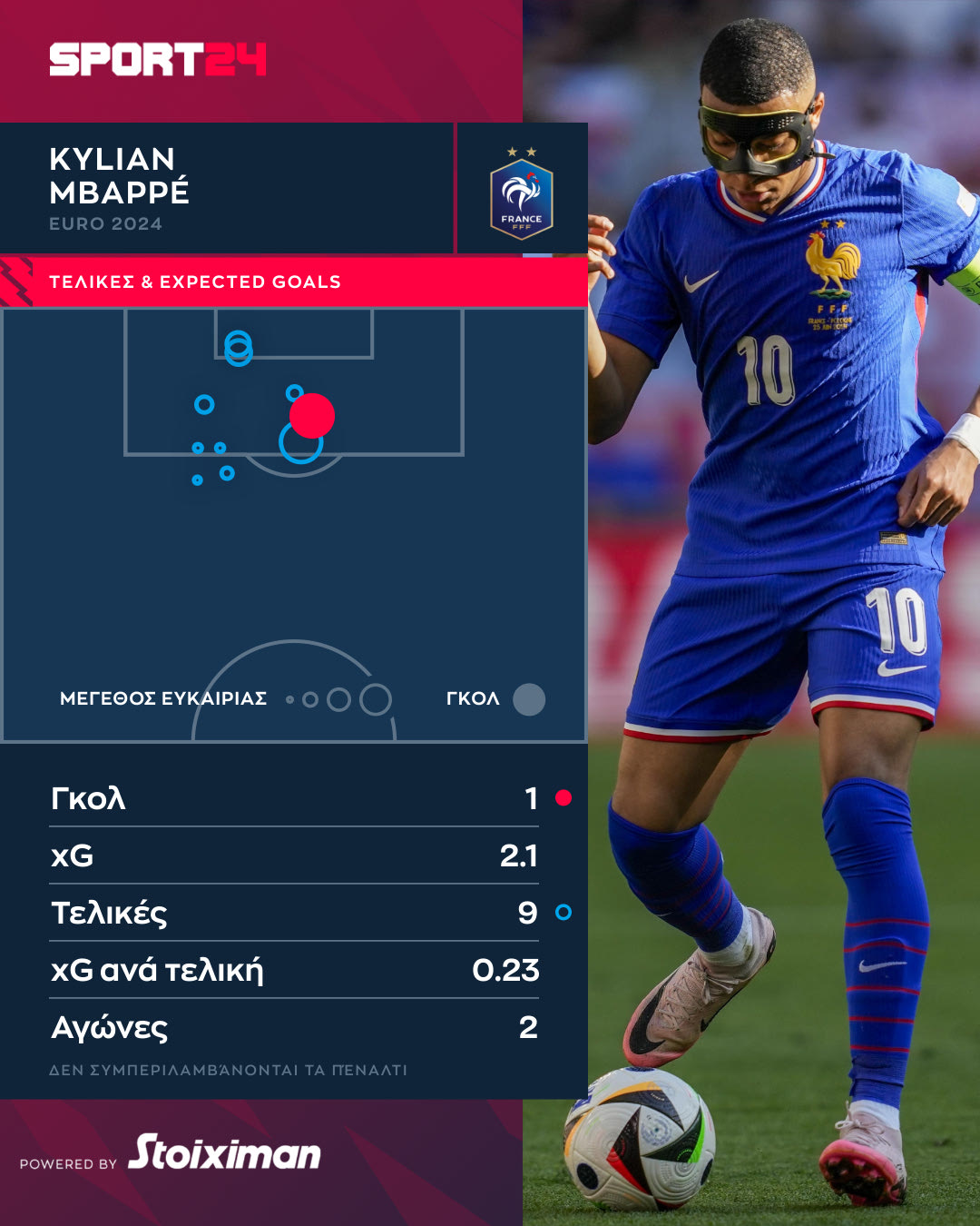 Έτσι η γενική σούμα του Εμπαπέ είναι 1 γκολ σε 2.1xGoals στο σύνολο σε δύο ματς, αλλά χωρίς το πέναλτι είναι άσφαιρος σε 1.32 xGoals. Νούμερα που θα πρέπει να βελτιώσει ως αιχμή του δόρατος για να μπορέσει η Γαλλία να φτάσει στην κορυφή της Ευρώπης.