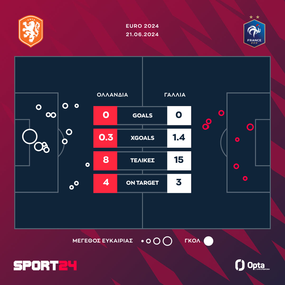 Κόντρα στους οράνιε οι Γάλλοι ολοκλήρωσαν το ματς με 15 τελικές (και πάλι οι τρεις βρήκαν στόχο) με τη συνολιή τους αξία να φτάνει τα 1.43 xGoals. Η απειλή ήταν μειωμένη σε σχέση με την Αυστρία, καθώς αυτή τη φορά επιχείρησαν αρκετά σουτ εκτός περιοχής.