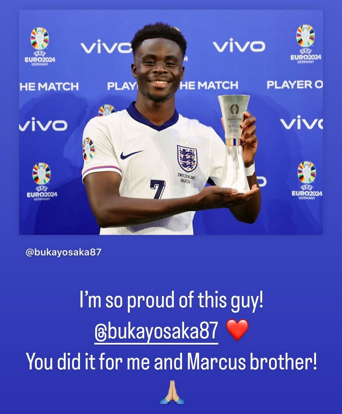 Ο Μπουκαγιό Σάκα ήταν εκ των διακριθέντων στην πρόκριση της Αγγλίας κόντρα στην Ελβετία, με τον Τζέιντον Σάντσο να αναφέρεται μέσω των προσωπικών του λογαριασμών στα social media στην ανακήρυξη του εξτρέμ της Άρσεναλ ως MVP του αγώνα.