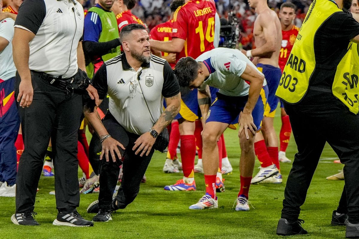 Συγκεκριμένα, κι ενώ οι Ισπανοί πανηγύριζαν την πρόκρισή τους στον τελικό του Euro 2024 ένας οπαδός εισέβαλε στον αγωνιστικό χώρο, με αποτέλεσμα να κινητοποιηθεί η ασφάλεια του γηπέδου.