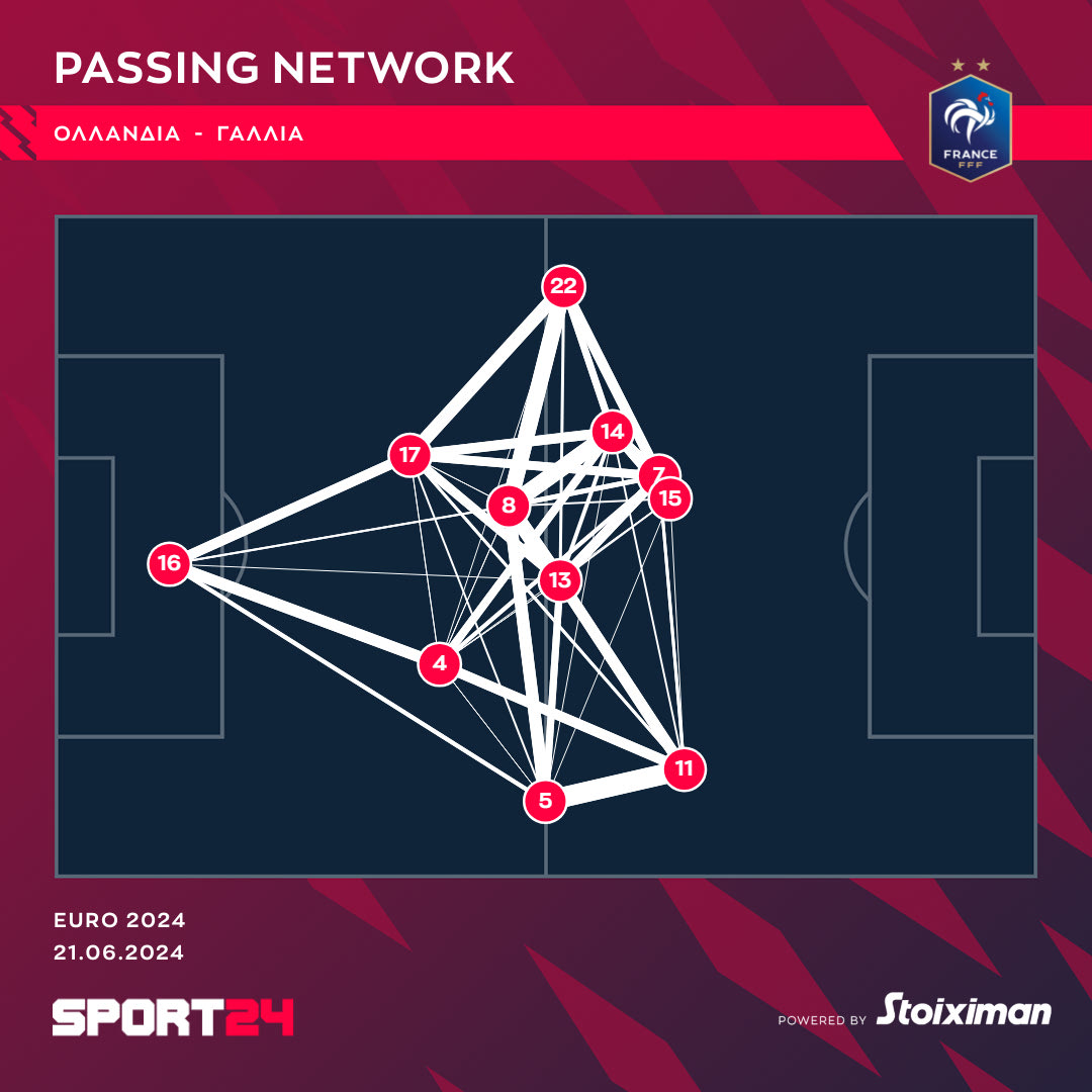 Στο γράφημα της Opta/Stats Perform μπορείτε να δείτε το δίκτυο μεταβιβάσεων, αλλά και τον μέσο χώρο δράσης των ποδοσφαιριστών της Γαλλίας κόντρα στην Ολλανδία.