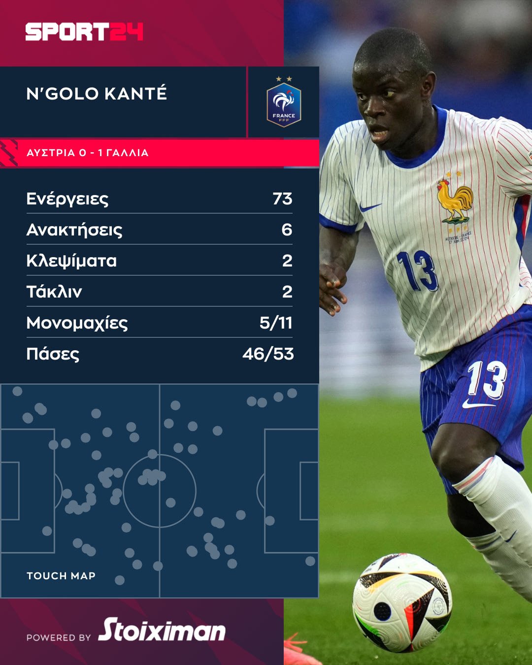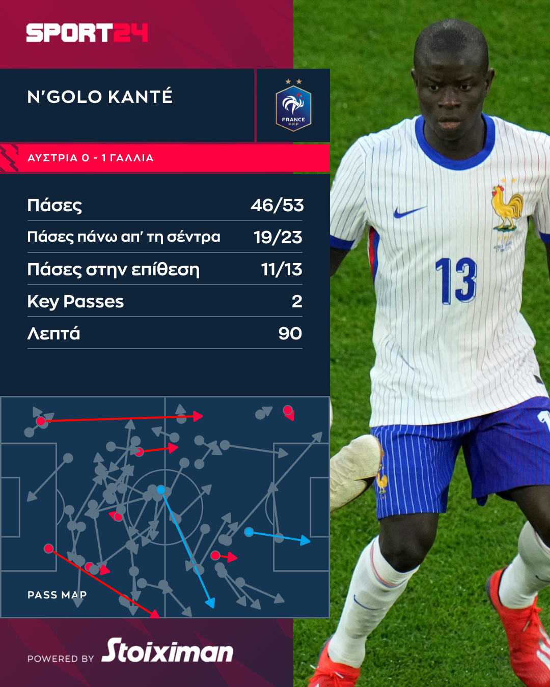 Ο Ενγκολό Καντέ ήταν ο MVP στη νίκη της Γαλλίας επί της Αυστρίας (1-0). Κινήθηκε παντού στον αγωνιστικό χώρο, ήταν ακούραστος και κάνει τον Ντεσάμπ να τρίβει τα χέρια του.