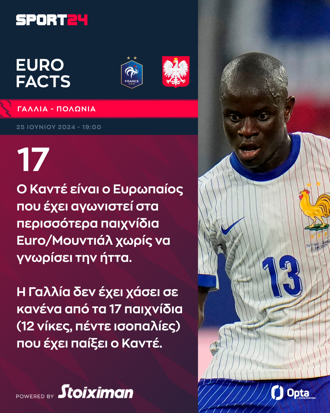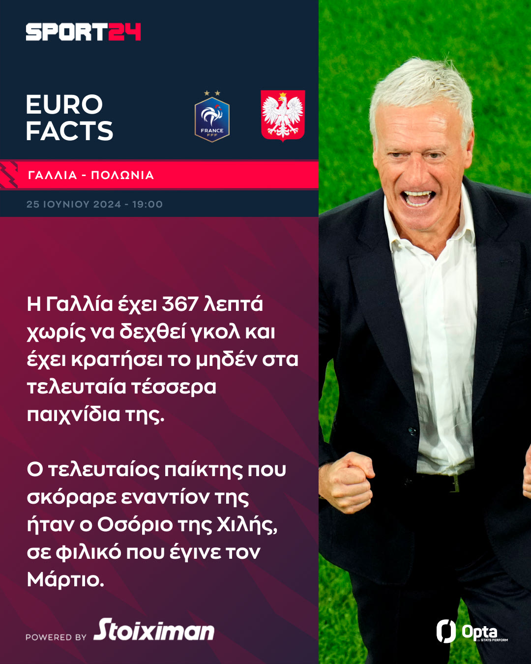 Η Γαλλία αντιμετωπίζει την Πολωνία που είναι με την πλάτη στον τοίχο για να κλείσει θέση στους "16" του Euro 2024. Δείτε κάποια ενδιαφέροντα στοιχεία της αναμέτρησης από την Opta.