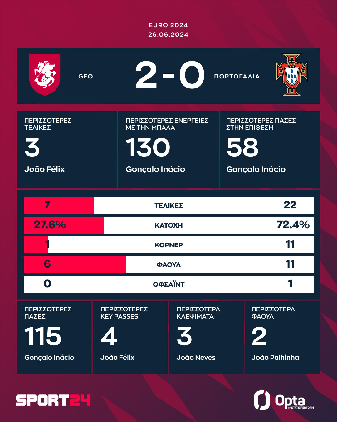 Το πείσμα των Πορτογάλων να βρουν την ισοφάριση πριν το φινάλε του πρώτου μέρους τους κράτησε ψηλά, έξω από τη μεγάλη περιοχή της Γεωργίας, όμως οι Παλίνια και Φέλιξ δεν μπόρεσαν να βρουν δίχτυα στα τελευταία λεπτά, για να πάνε έτσι οι δύο ομάδες στα αποδυτήρια με τους Γεωργιανούς να κρατούν πειστικά το υπέρ τους 1-0 (0.3-05 τα xgoals) και να απέχουν 45 λεπτά από το θαύμα της πρόκρισης.