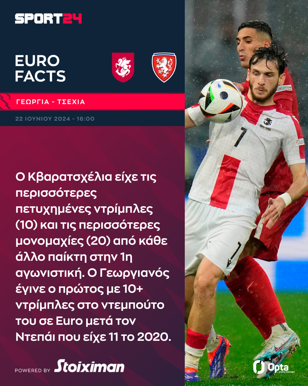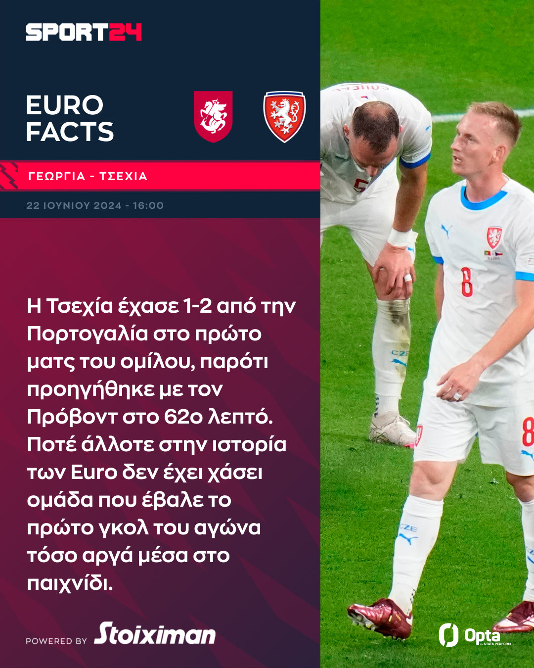 Η Γεωργία κοντράρεται με την Τσεχία (22/6, 16:00, ΕΡΤ1, LIVE SPORT24) σ’ ένα κρίσιμο παιχνίδι για την εξέλιξη του 6ου ομίλου του Euro 2024, με τις δύο ομάδες να ψάχνουν την πρώτη τους νίκη, μετά τις ήττες που υπέστησαν στην πρώτη αγωνιστική. Πάμε να δούμε ορισμένα στοιχεία για την αναμέτρηση με τη βοήθεις της Opta.