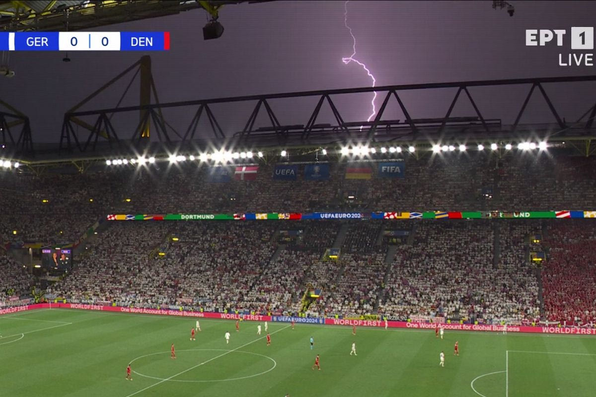 Το παιχνίδι της Γερμανίας με τη Δανία διεκόπη προσωρινά λόγω κεραυνών και ισχυρής καταιγίδας που εξελίχθηκε σε χαλαζόπτωση στο Ντόρτμουντ.