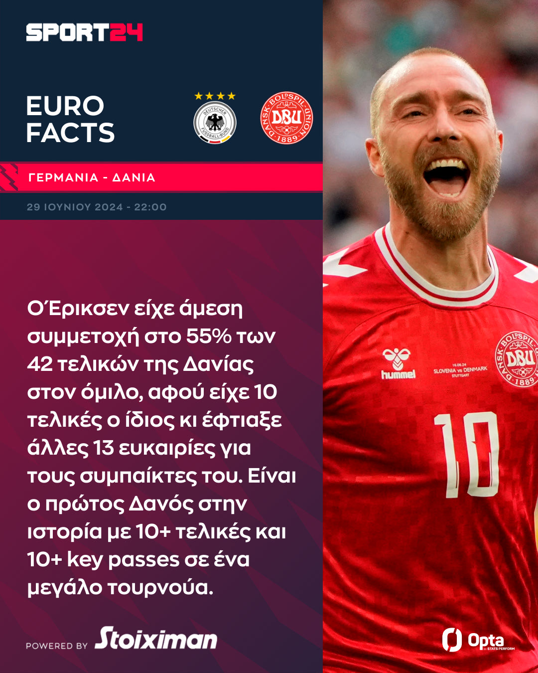 O Κρίστιαν Έρικσεν είχε άμεση συμμετοχή στο 55% των 42 τελικών της Δανίας στον όμιλο, αφού είχε 10 τελικές ο ίδιος κι έφτιαξε άλλες 13 ευκαιρίες για τους συμπαίκτες του. Είναι ο πρώτος Δανός στην ιστορία με 10+ τελικές και 10+ key passes σε ένα μεγάλο τουρνούα, Euro ή Μουντιάλ.
