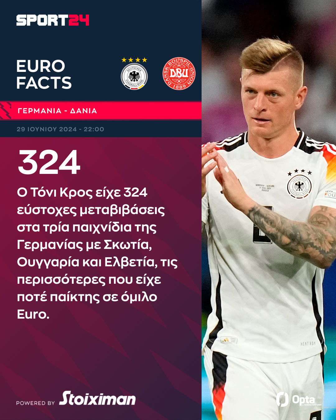 Ο Τόνι Κρος είχε 324 εύστοχες μεταβιβάσεις στον όμιλο, τις περισσότερες που είχε ποτέ παίκτης σε όμιλο Euro. Ανάμεσα σε όλους τους παίκτες που έχουν τουλάχιστον 1.000 λεπτά στη διοργάνωση μετά το 1980, ο Κρος έχει τις περισσότερες εύστοχες πάσες, με μέσο όρο 92 πάσες ανά 90 λεπτά.